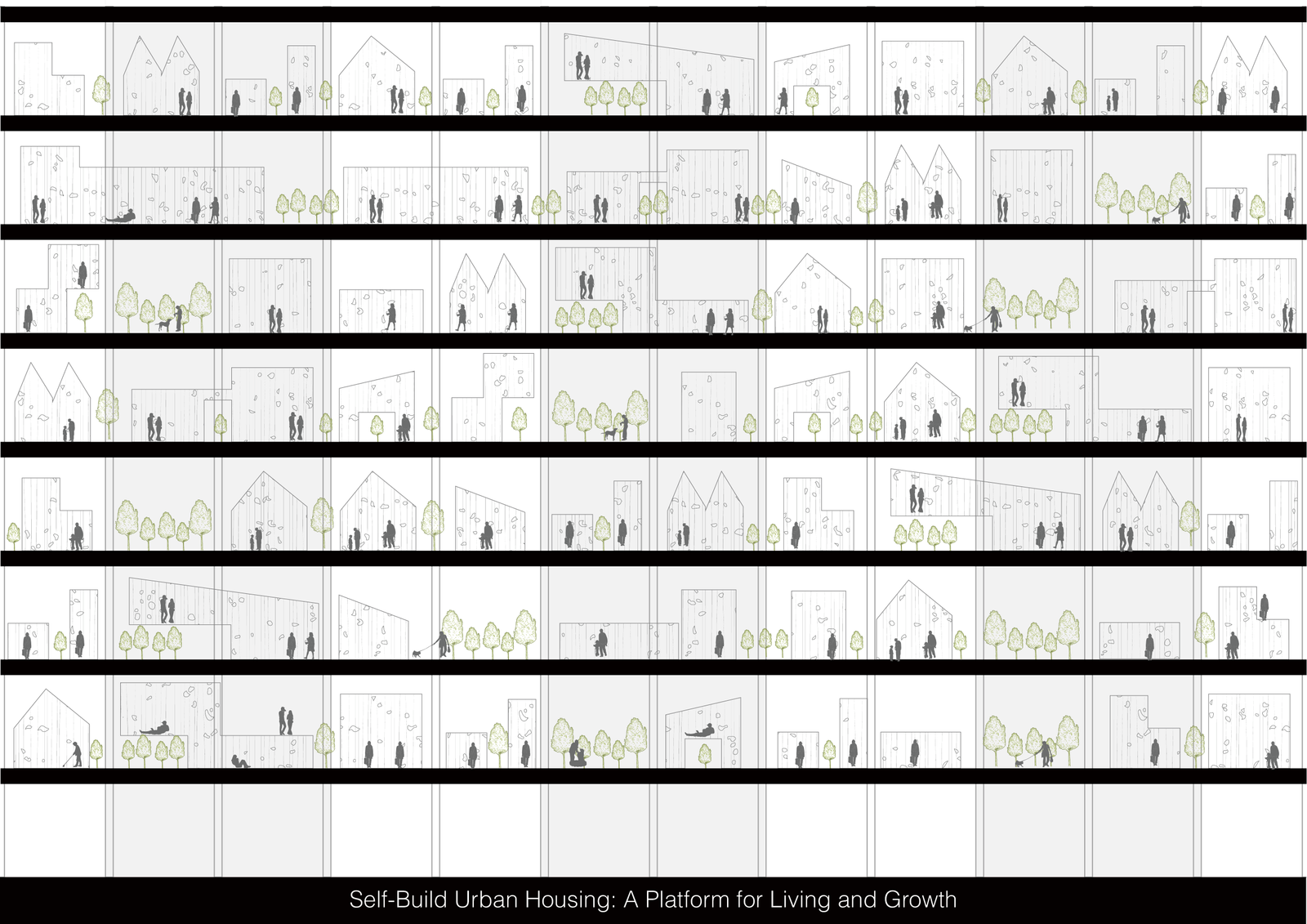 이러한 문제의식 속에서 새로운 공동주거 모델을 고안하였다. 이 프로젝트는 도시 속에서 개인이 스스로 주거의 기반을 구축하고, 자신의 삶에 맞는 집을 만들어가는 새로운 주거 모델로서 고정된 주거 형태에서 벗어나, 유연하게 변화하며 성장하는 도시형 주거의 가능성을 제안한다.