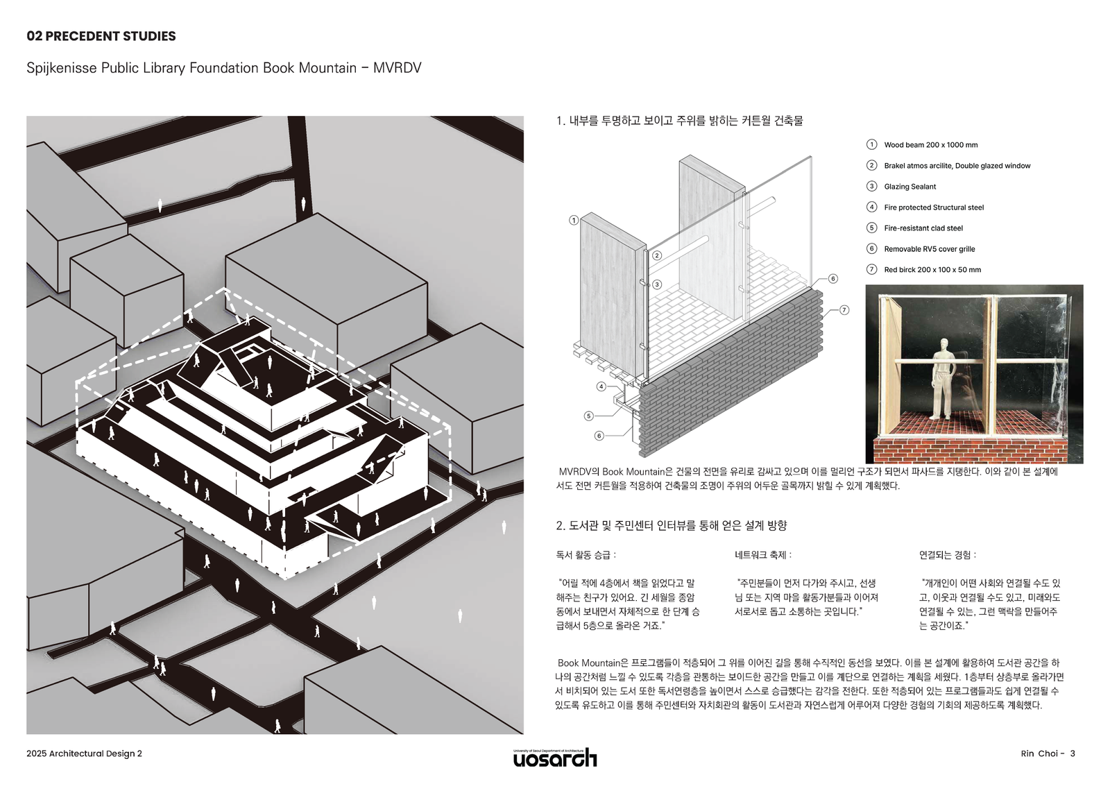 설계에 앞서, MVRDV의 'Book Mountain' 사례를 분석했다. 이 건축물은 투명한 커튼월을 통해 내부의 적층된 프로그램이 밖으로 드러나고, 늦은 오후 도서관에서 새어 나오는 불빛이 도시를 밝히는 모습이 인상적이었다. 9또한, 책으로 둘러싸인 계단을 통해 상층부로 오르는 경험은 공간적 시퀀스의 중요성을 시사했다. 이와 함께 현재 종암동 주민센터의 운영자와 이용자 인터뷰를 통해 세 가지 중요한 키워드를 도출했다.