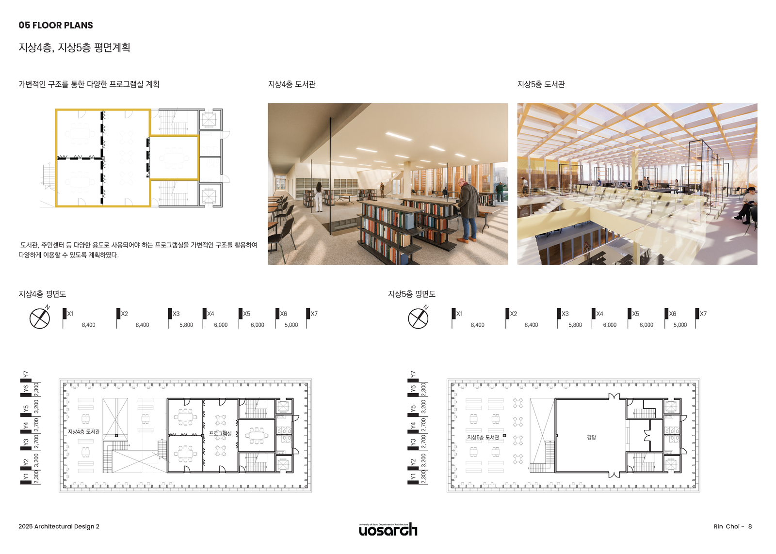 4층과 5층은 가변형 프로그램실과 강당으로 구성된다. 시대가 변하면 주민들이 필요로 하는 프로그램도 달라진다. 따라서 시기에 따라 도서관과 주민센터의 프로그램이 유동적으로 운영될 수 있도록 가변적인 구조 시스템을 적용했다. 이는 미래의 변화에 유연하게 대응하는 지속 가능한 공간이 될 것이다.