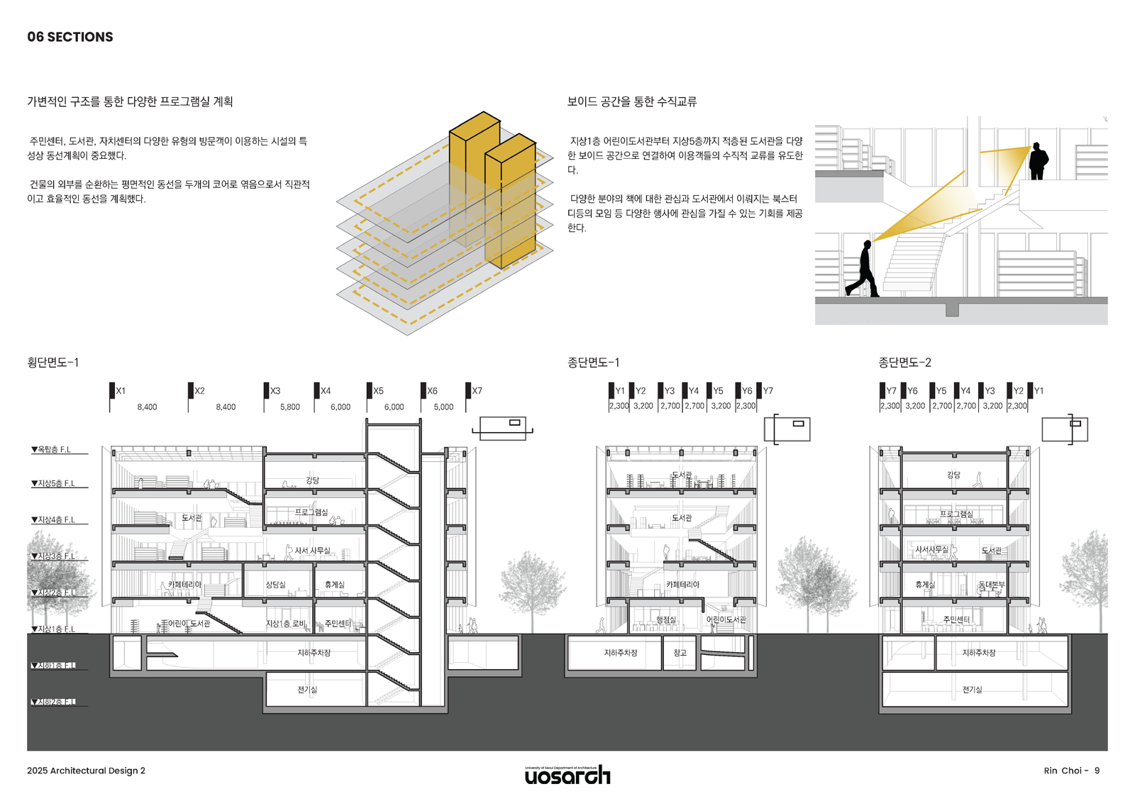 건물 전체를 수직으로 관통하는 공간이 있다. 이 공간은 1층 어린이 도서관부터 5층까지 시각적으로 연결해 준다. 층별로 단절될 수 있는 도서관을 하나로 묶어주며, 이용자들이 다른 층의 활동을 자연스럽게 인지하게 하여 수직적인 교류를 유도한다. 각 층의 둘레에 순환형 동선을 두어, 다양한 각도에서 도시 풍경을 조망할 수 있게 함과 동시에 오픈된 프로그램들을 자연스럽게 엮어주도록 했다. 이러한 단순 명료한 동선은 이용자가 공간을 직관적으로 이해하고 편안하게 느끼도록 도울 것이다.