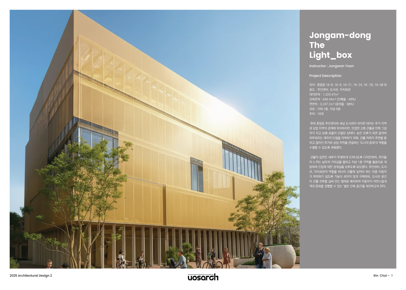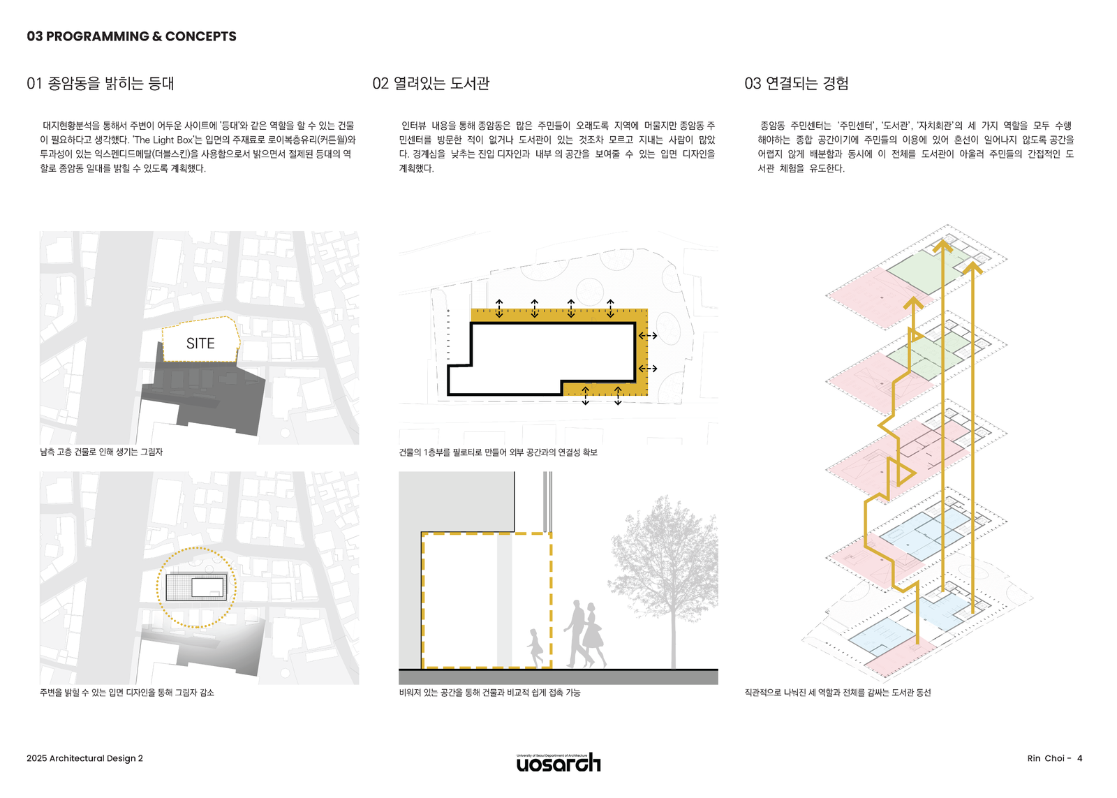 본 프로젝트는 현재 종암동 주민센터가 위치한 대지와 그 연접 대지를 통합하여, 주민센터와 도서관이라는 두 가지 공공 기능이 상호 보완하며 원활히 작동할 수 있도록 하는 제안이다. 대상지는 주거 지역과 상업 지역의 경계에 위치해 있어 잠재력이 크다고 봤다. 하지만 인접한 고층 건물들로 인해 늦은 오후만 되어도 급격히 어두워진다는 문제가 있다. 이러한 대지의 단점을 극복하고자 건물 자체가 어두운 주변을 밝히고, 서로 다른 성향의 지역을 이어주는 '도시의 등대'로 작동하는 공간을 계획했다.