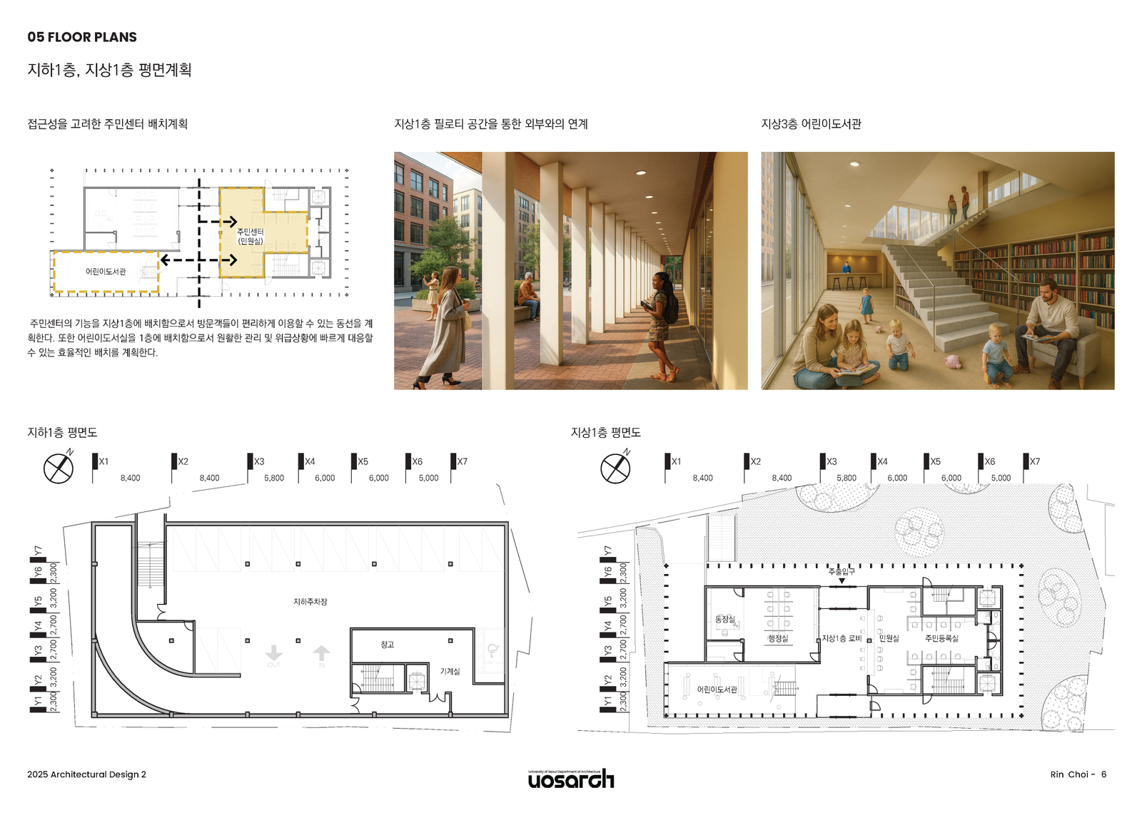 1층은 철저히 접근성과 공공성에 초점을 맞췄다. 가장 빈번하게 이용되는 민원실을 전면에 배치하여 편의성을 높였고, 관리자의 효율적인 운영을 위해 어린이 도서관 역시 1층에 두었다. 1층의 필로티 공간은 주민들이 오가며 자연스럽게 모이고 쉴 수 있는 전이 공간으로서, 건축물이 외부 도시 조직과 연결되도록 했다.