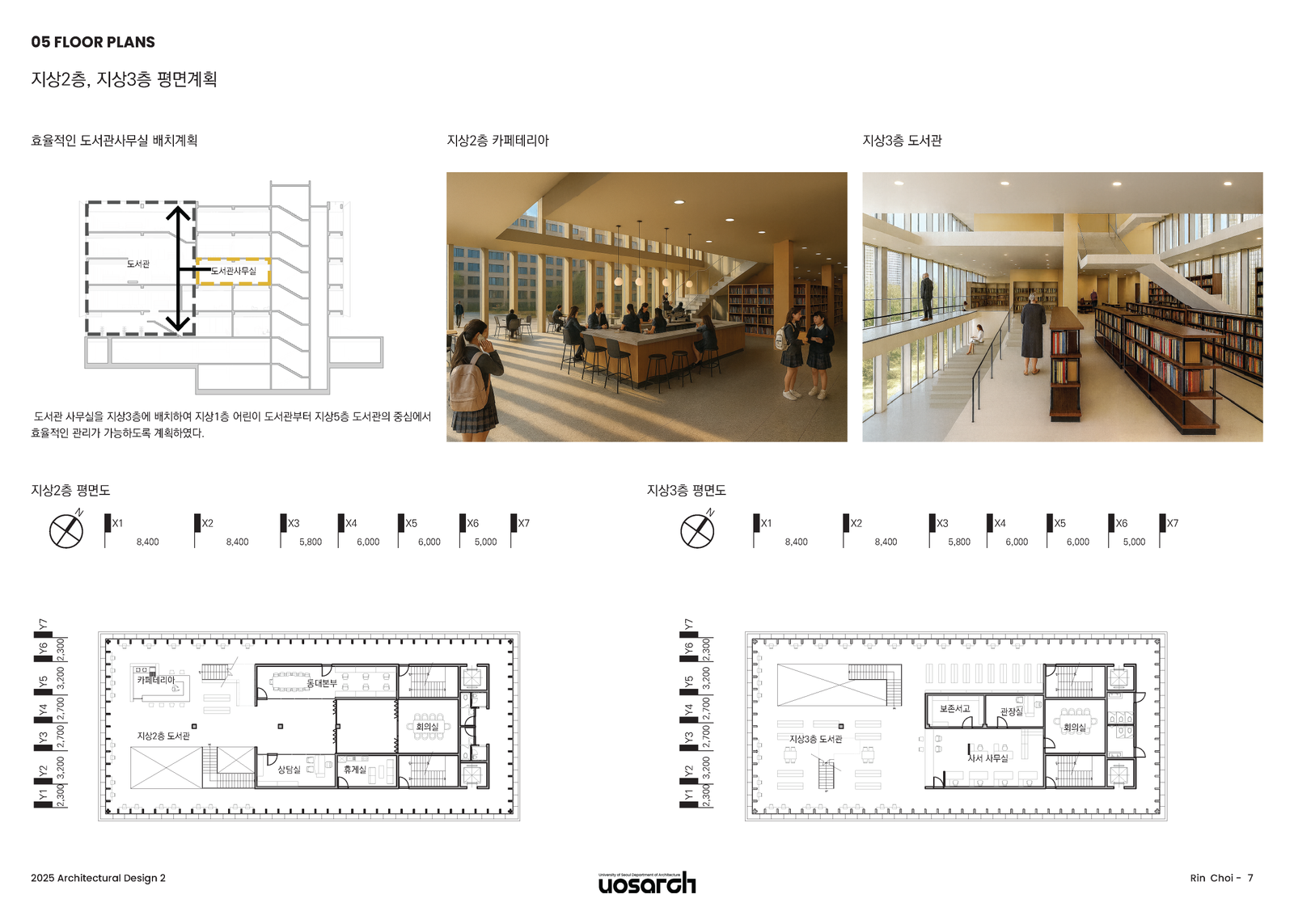 2층과 3층은 커뮤니티와 운영의 중심 공간이다. 2층에는 카페테리아와 열람 공간을 배치하여 주민들이 편안하게 머무를 수 있게 했고, 3층에는 도서관 사무실을 두었다. 특히 도서관 사무실을 건물의 허리인 3층에 배치하여 이를 통해 1층의 어린이 도서관과 상층부의 일반 도서관을 동시에 효율적으로 관리할 수 있는 '컨트롤 타워' 역할을 수행하게 된다.