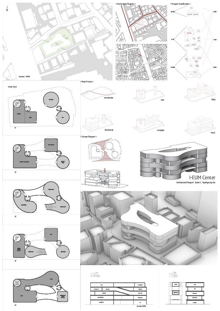 종암동 대상지는 대로변과 골목 사이에 위치하여 사람들의 통행이 많은 곳이다. 이로 인해 사이트 내부에서 사람들의 통행이 가장 많을 것으로 예상되는 길을 1층에서 오픈하여 사람들의 동선이 자유롭도록 유도했다. 프로그램은 크게 주민센터, 자치회관, 도서관으로 나뉘며 이를 유동적, 기능적, 복합적 공간으로 프로그램들을 재분류하였다. 유동적인 공간은 원형과 곡선을, 기능적인 공간은 직선을, 복합적인 공간은 직선과 곡선을 함께 사용하여 프로그램의 성격을 매스에서 드러나게 했다.