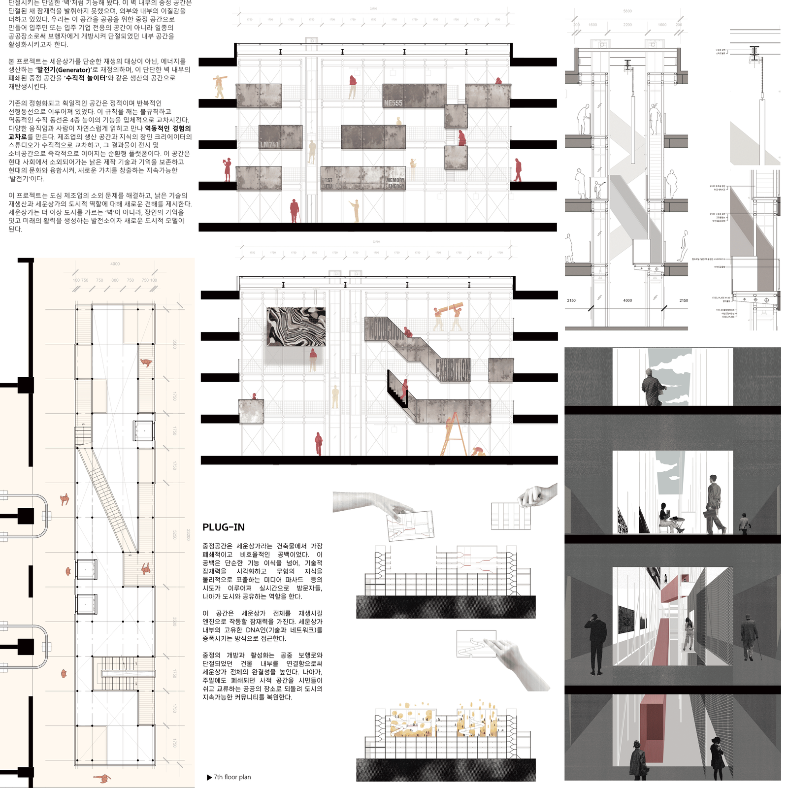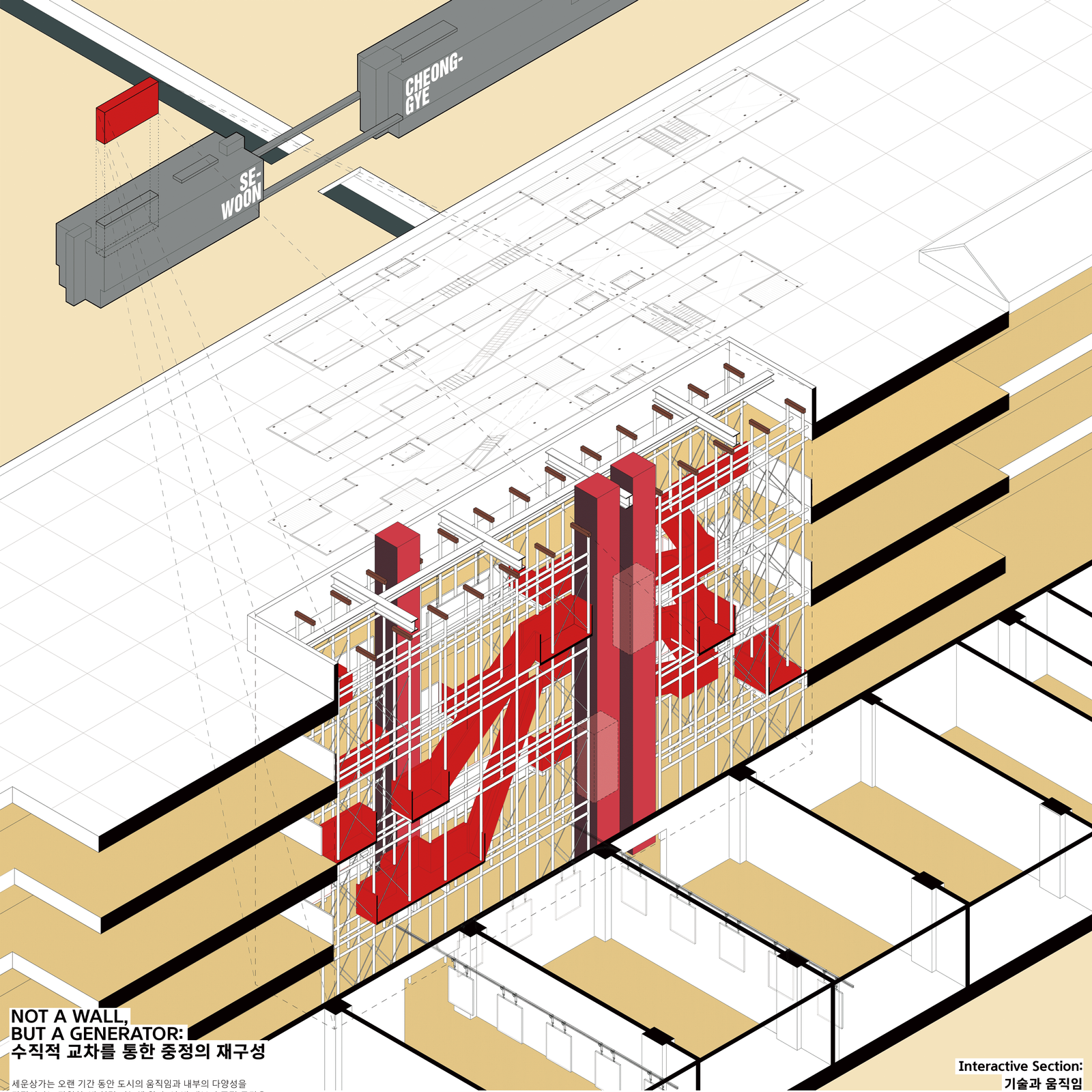 세운상가는 오랜 기간 단일한 '벽'처럼 도시의 움직임과 내부의 다양성을 단절시켜왔으나, 본 프로젝트는 이 벽 내부의 폐쇄된 중정을 ‘수직적 놀이터'와 같은 융합 플랫폼으로 재탄생시키고자 한다. 이곳에서는 낡은 제조업의 생산 공간과 전시, 소비 공간이 수직적으로 교차하며, 다양한 움직임과 사람이 자연스럽게 얽히고 만나 역동적인 경험의 교차로를 만든다. 이 공간은 현대 사회에서 소외되어가는 낡은 제작 기술과 기억을 보존하고 현대의 문화와 융합시켜, 새로운 가치를 창출하는 지속가능한 ‘발전기'가 될 것이다.