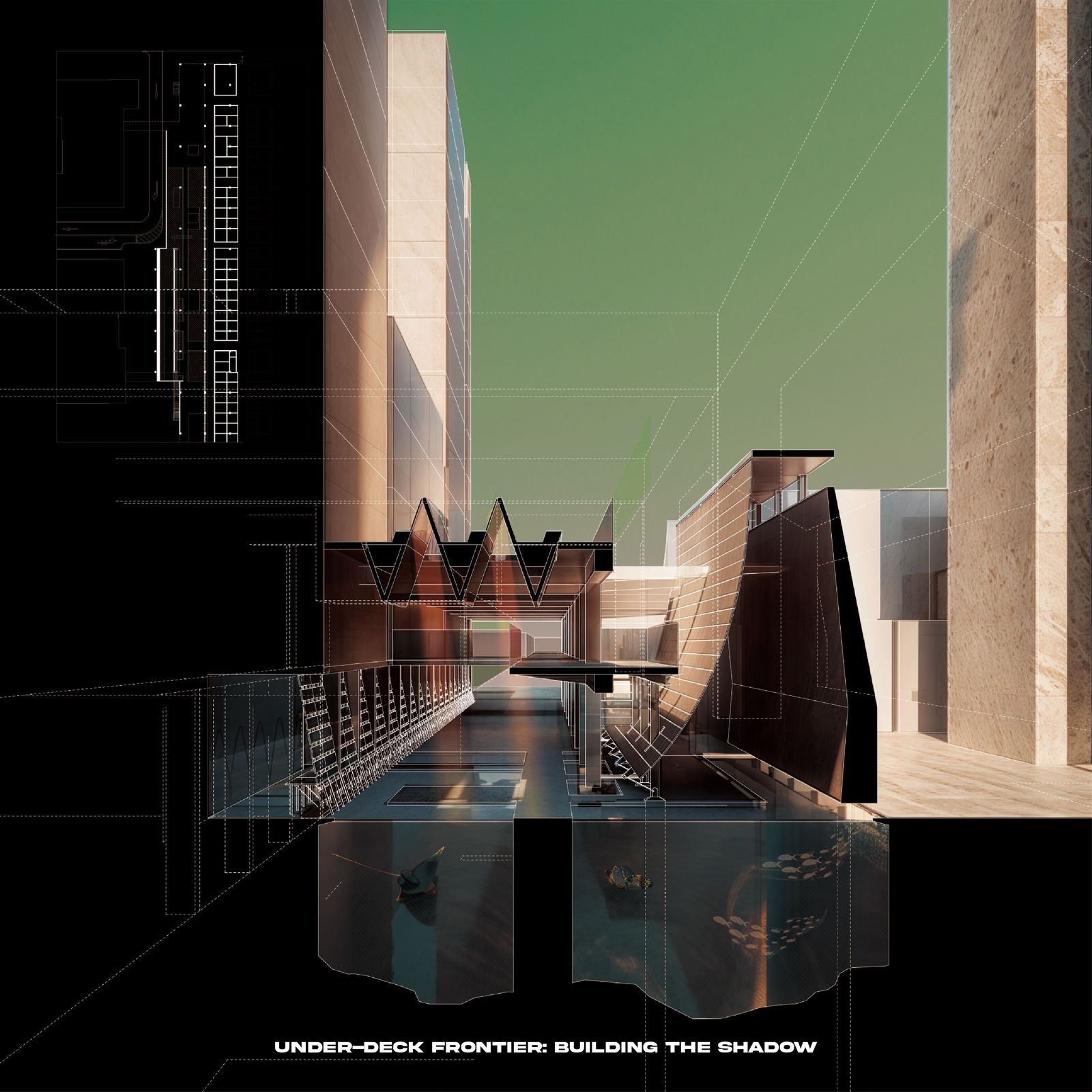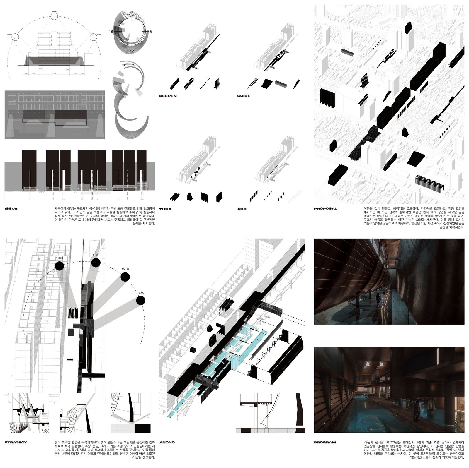 세운상가 하부 공간은 도시의 잠재된 중심부가 아닌, 주차와 적재가 만연한, 공공성을 상실한 어둡고 열악한 도시의 흉터이다. 이러한 환경 속에서, 이 프로젝트는 구조적인 어둠을 도시적 잠재력을 지닌 '언더-데크 프론티어'로 재해석한다. 측광, 천광, 인공광이라는 세 가지 빛 요소를 정교하게 제어하여 네 단계의 어둠을 경험하는 공간을 창조한다. 어둠의 전시 공간으로 이 방치된 도시적 공극을 활성화함으로써, 그림자를 긍정적이고 극적인 건축 재료로 인식하도록 도전한다. 궁극적으로, 이 프로젝트는 방치된 도시 기반 시설을 활성화하고 도시 내 숨겨진 공간적 가치를 극대화하는 건축적 개입의 새로운 가능성을 제시한다.