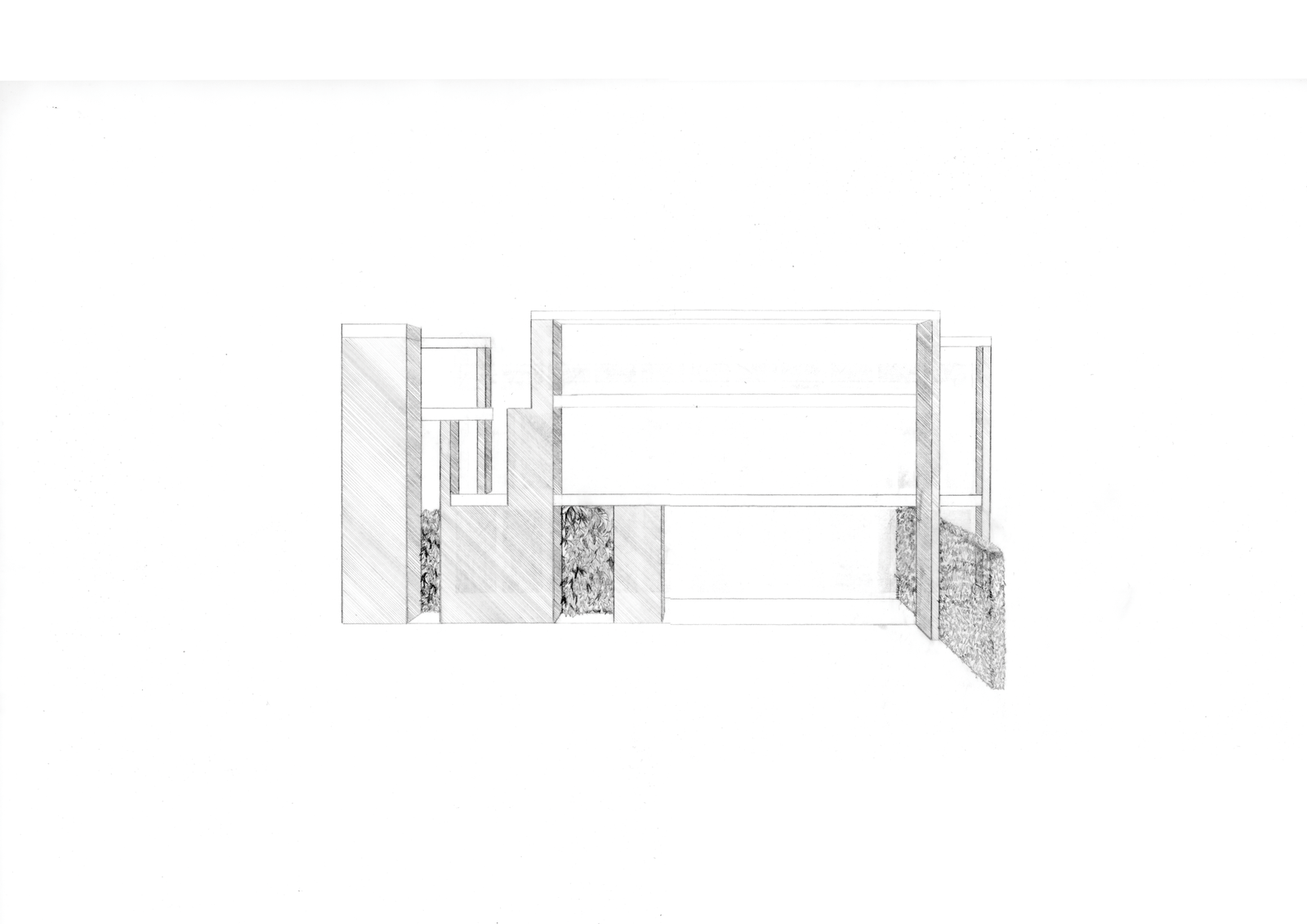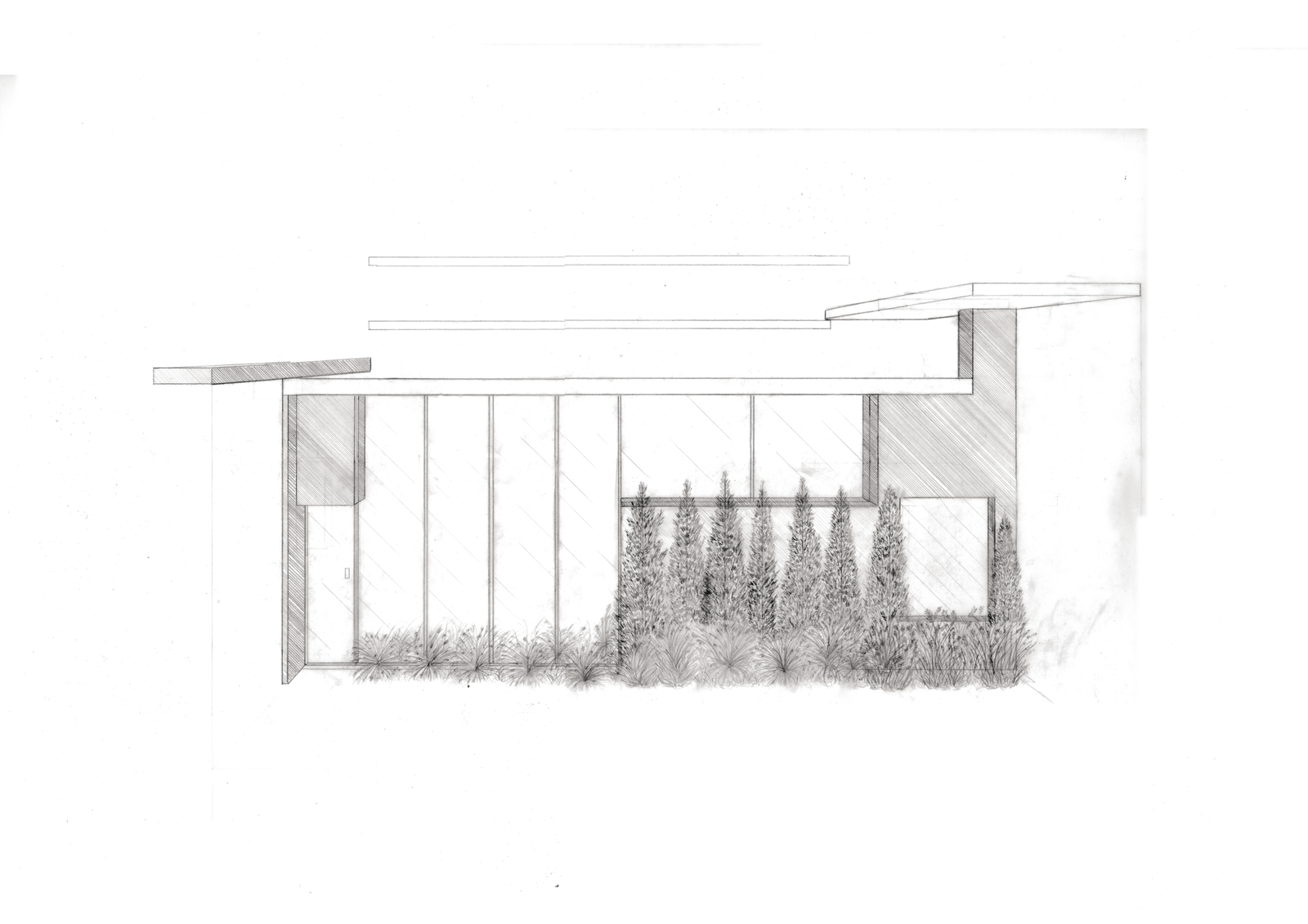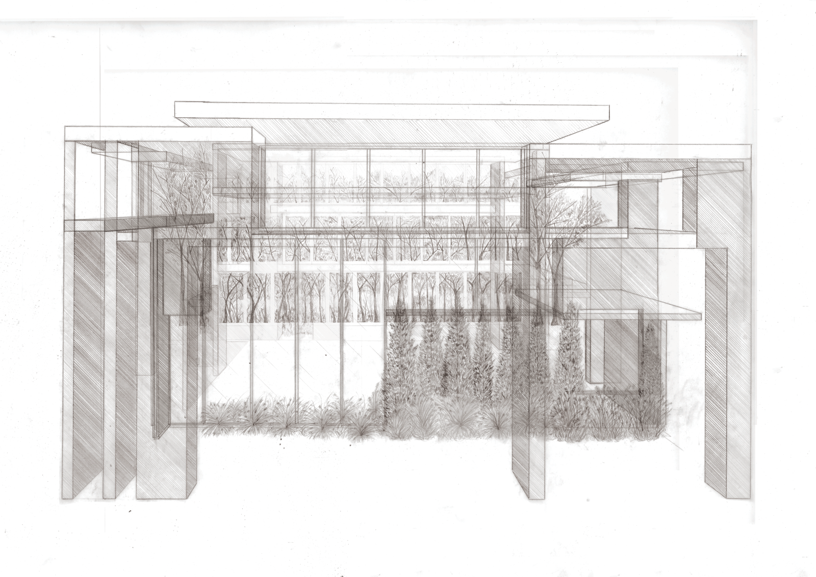 내가 삽입한 자연이 먼저 보이고, 외부의 자연이 건물의 기둥과 천장에 의해 내부로 들어오는 장면. 처음부터 이 장면을 보여주고자 하였고, 건물의 표현에서도 이 장면을 보여주고 싶었다. 그래서 이 사진과 참고한 스케치를 기반으로 드로잉을 시작했다