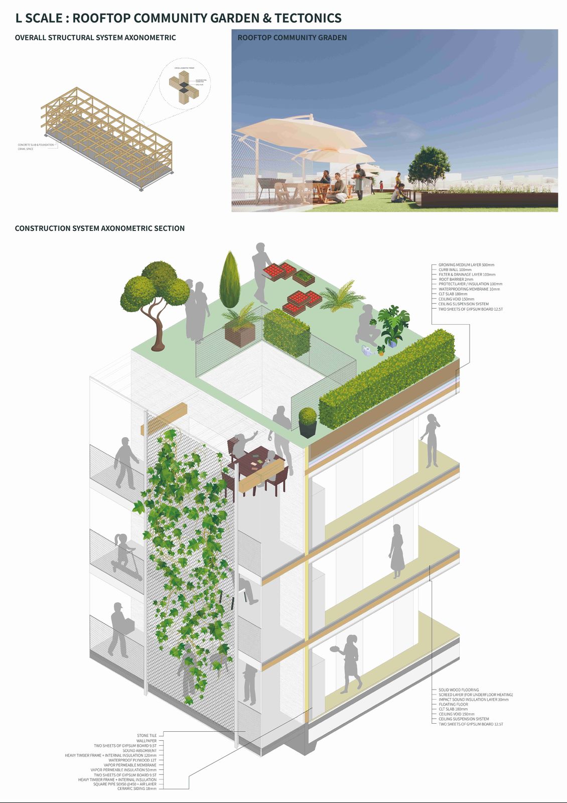 The crops grown on the rooftop naturally flow into the shared kitchen and workshop located in the central building.