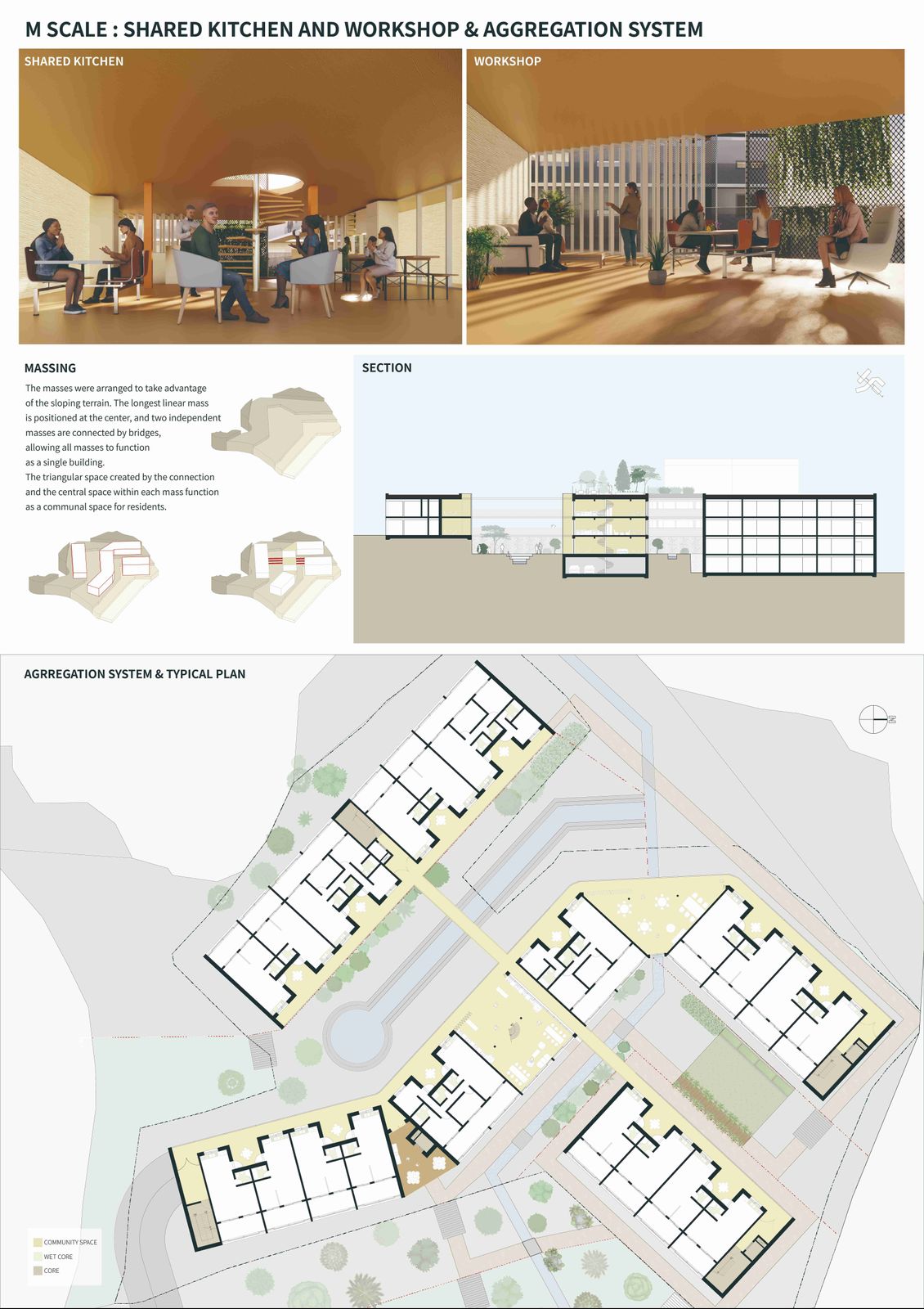 As shown in the aggregation system below, these shared programs are arranged in the gaps between the three separated masses, naturally forming communal spaces between the housing units.