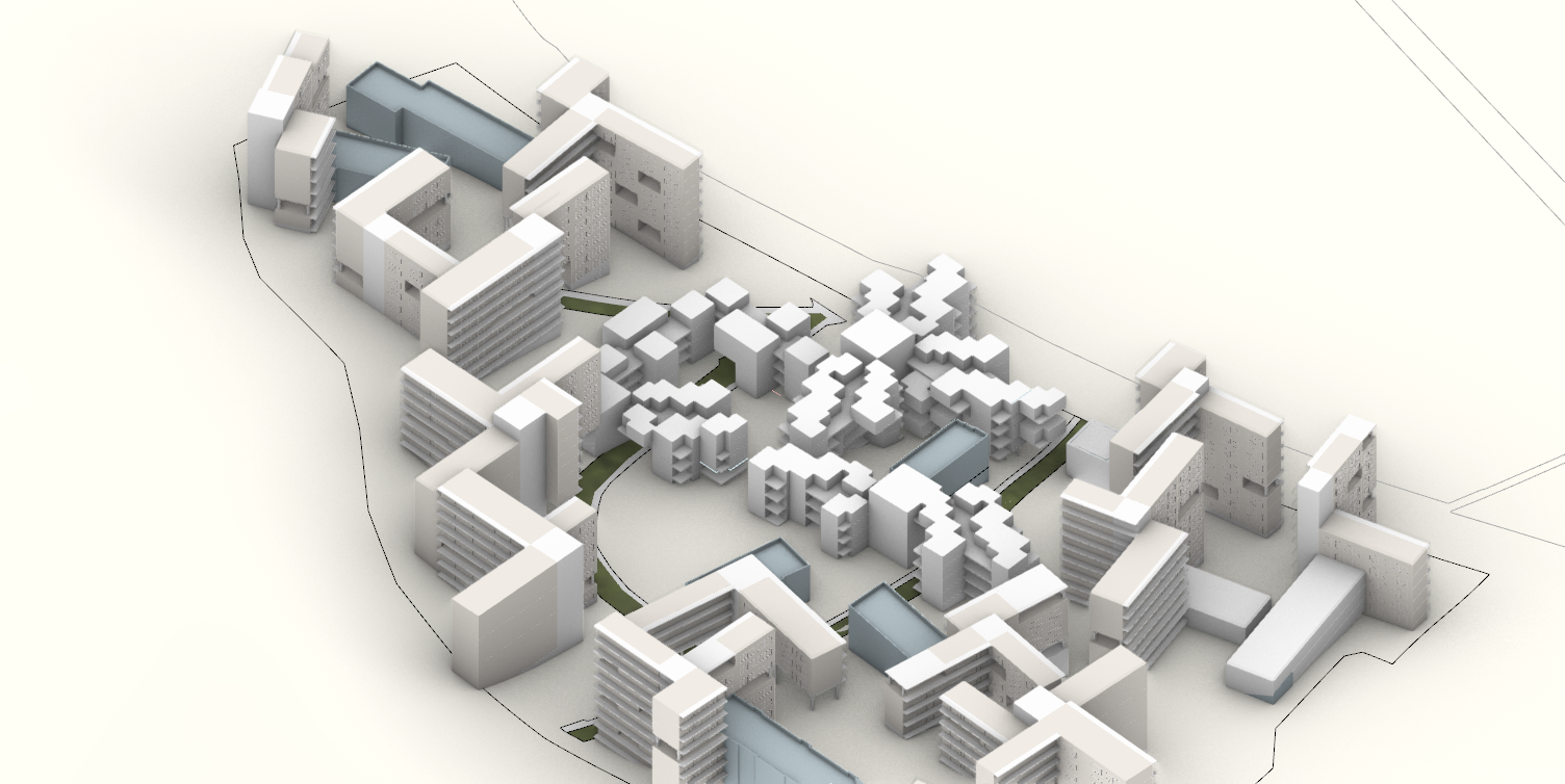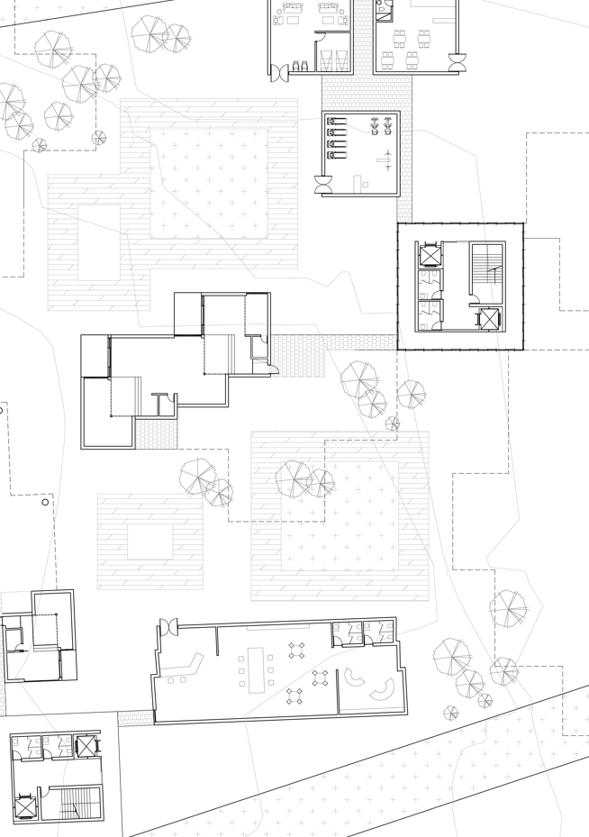 According to the form of fragmentation, various type of social spaces are designed and different pavements are allocated to it. Social programs, such as gym, nurturing center, cafe and library are located at facility bars and work as social spaces too. Existing building is also included in the modular system, functioning as a library in the plan.