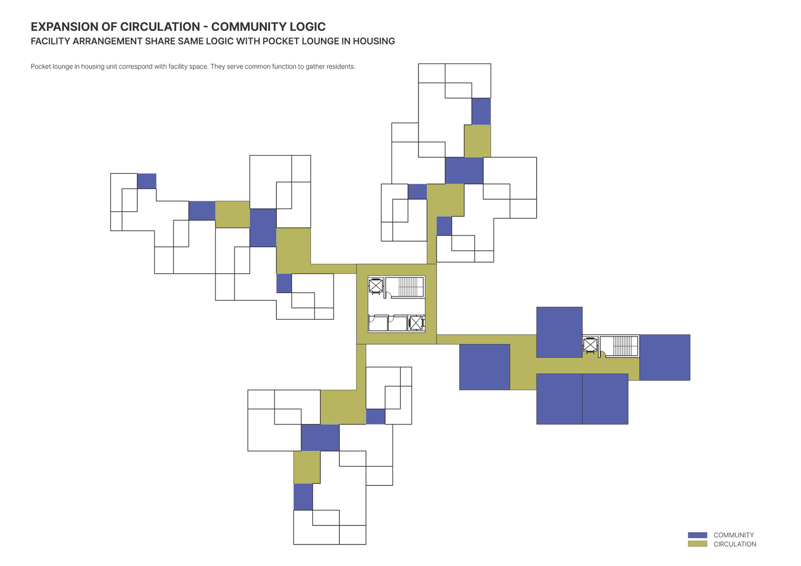 In the aggregation, I designed pocket lounge to activate natural interaction between residents and make space that can express own personality. Through pocket lounge, the scene of corridor become more diverse and function of corridor can extend from circulation to communication. The logic of 'circulation + social space' is maintained in every clusters that can be made infinitely.