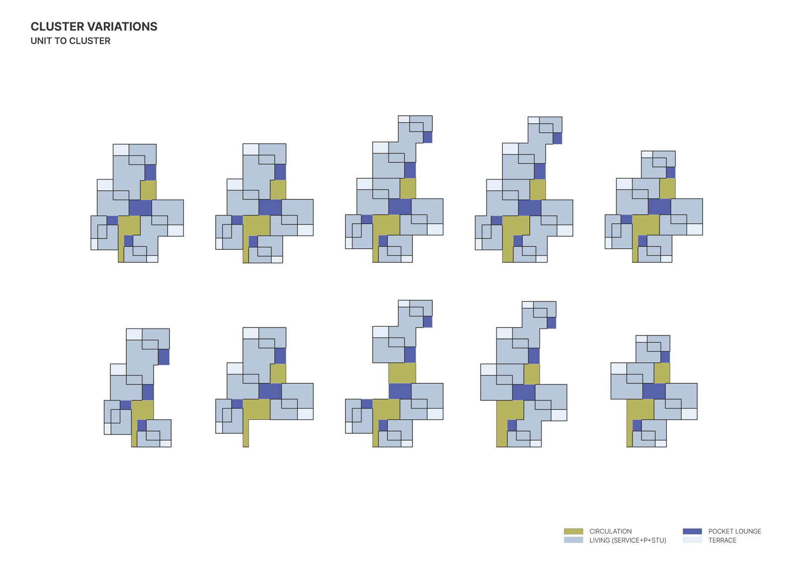 Each living units include studio, terrace and pocket lounge, and the size of them differs to the unit type. Basic unit named as Type A and Type B can be combined to form bigger units. To ensure the even quality of living (based on team scenario), number of people living in each units is fixed.