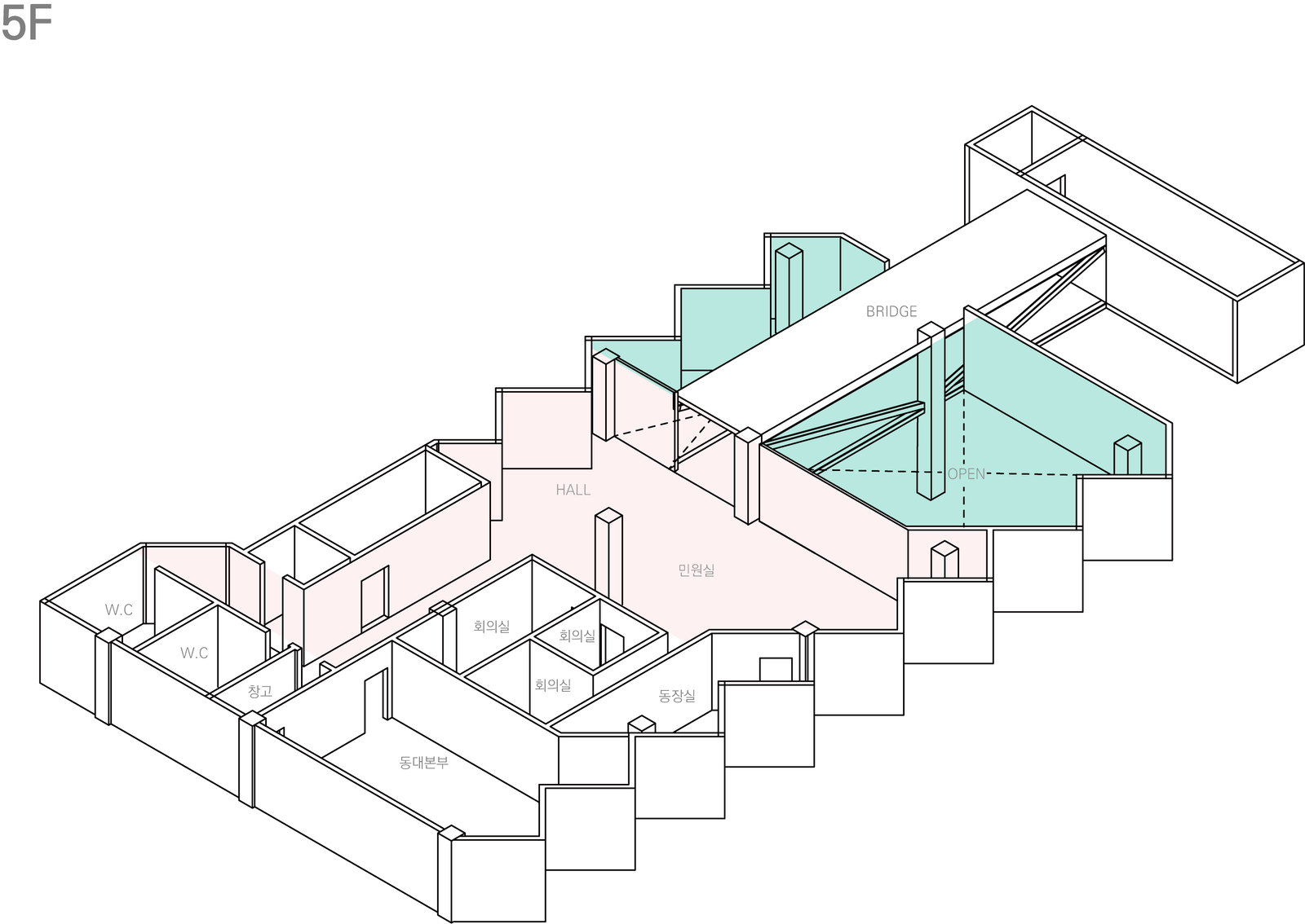 5층은 주민센터 이용을 주로 공간을 배치하였는데, 민원실과 홀을 중심으로 동대문부와 공유하는 회의실, 주민등록 서고 탕비실, 동장실을 배치해 쾌적한 민원실을 만들려고 하였다.철골 다리의 경우 최소한의 철골을 사용하는 트러스 구조를 차용해 시야를 가리지 않고 경관을 볼 수 있고 4층과 상호작용을 할 수 있도록 노력하였다.