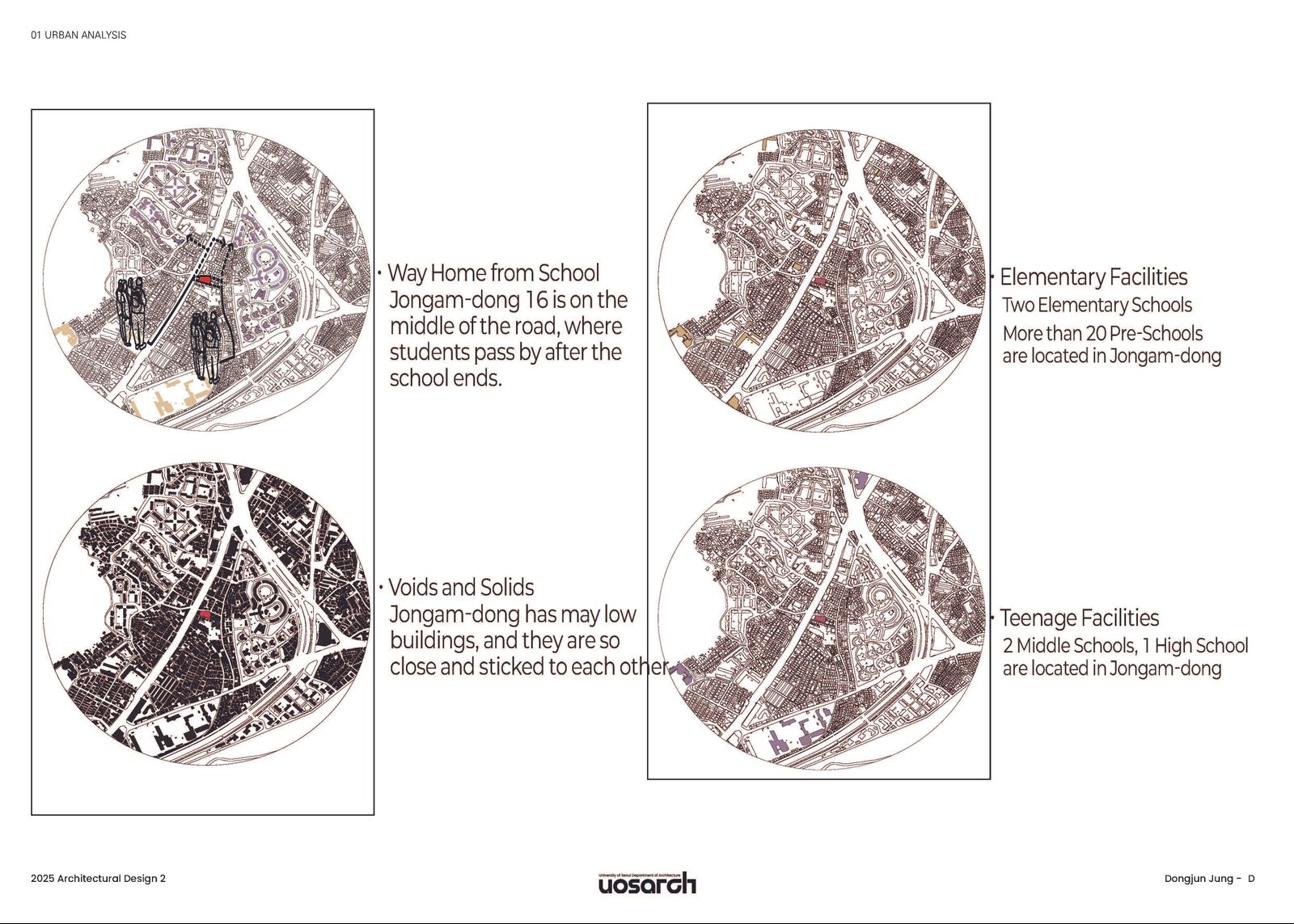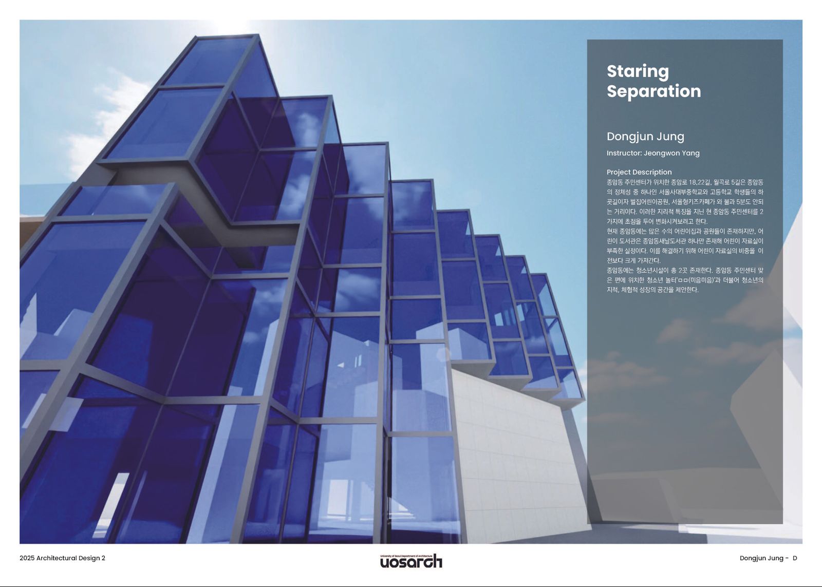 지리적으로 하굣길에 위치한 이 곳을 어린이와 청소년들의 하굣길에 흥미로운 컨텐츠를 제공함과 동시에 주민들의 민원을 처리하는 주민센터가 공존하기 위해서 주민센터와 도서관이 분리되어야 한다고 생각했고, 수직적으로 프로그램들을 배치하는 것으로 설계를 시작하였다. 5층에 주민센터를 배치하고 4층에는 일반 자료실과, 카페 3층에는 어린이 자료실과 놀이공간, 2층에는 청소년 자료실, 1층에는 청소년 자치시설을 배치해 하교하는 청소년들이 흥미를 느끼고 건물내로 유입될 수 있도록 배치하였다.