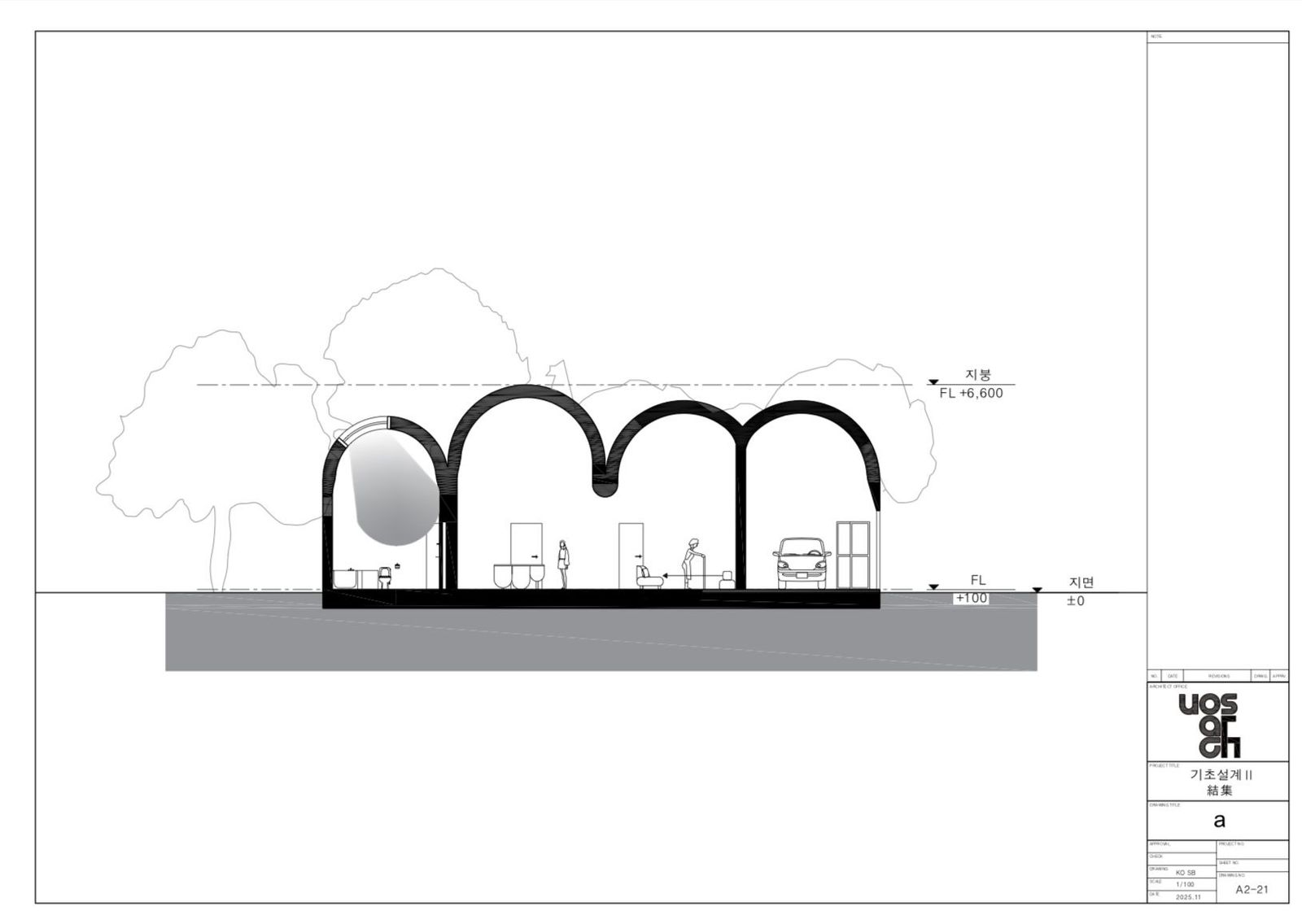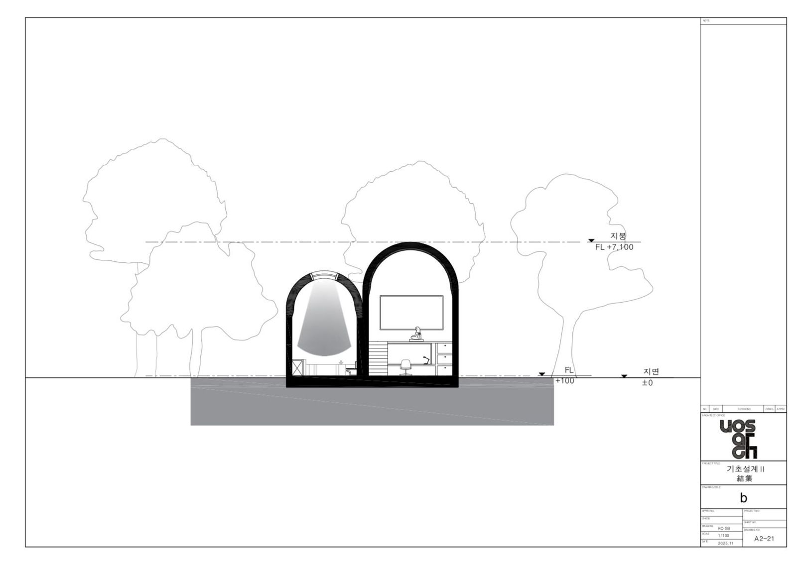 컨셉은 자연물: 자연 속에 있는 지오메트릭에서 영감을 받았다. 평면으로 잘라서 본다면, 텍타일과 벽체가 이루는 모습이 풍성한 나무를 댕강 잘라버린 것처럼 보인다. 입면상으로는 식빵같단 의견이 우세하지만 나는 퐁실퐁실한 나무를 끌고 온 것이다.