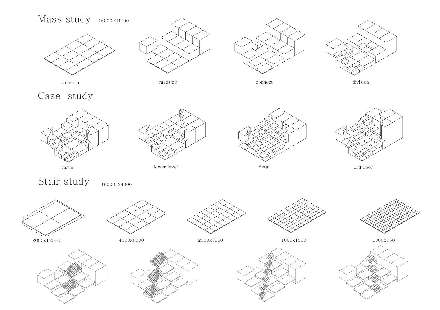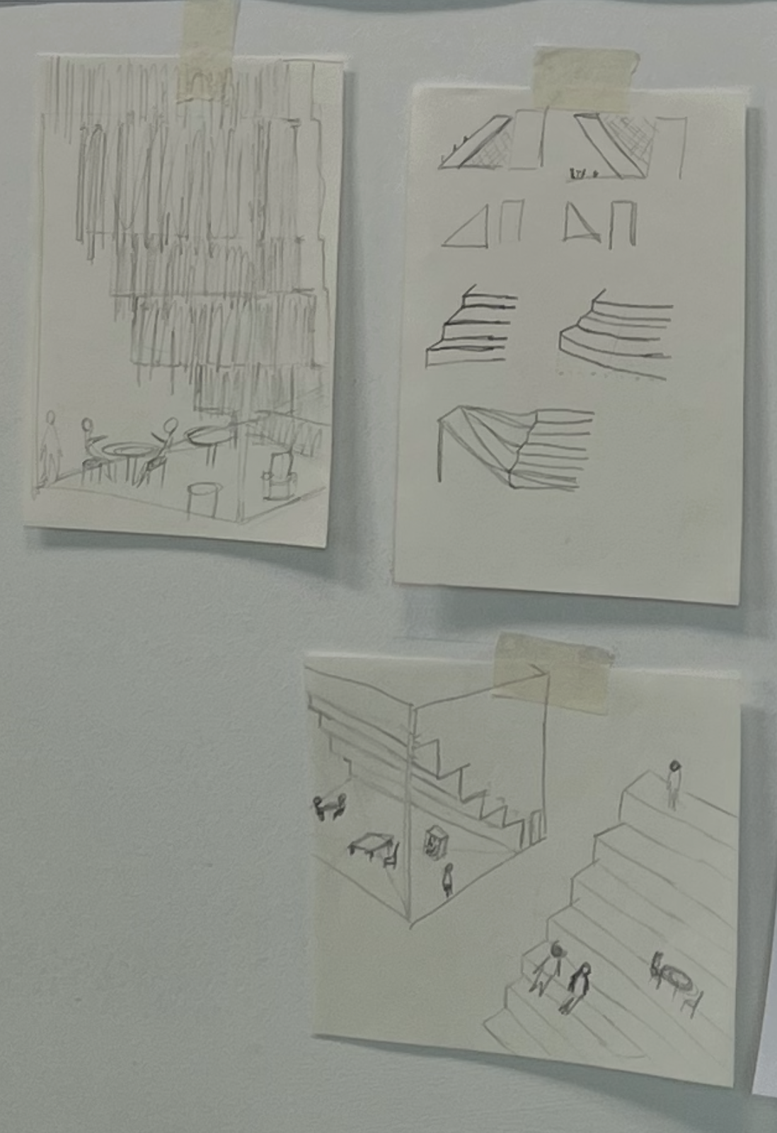 첫 시작은 사이트 답사다. 사이트 B의 cu의 테라스에서 사람들이 담소를 나누고 있는 모습이 보기 좋다고 느꼈고, 이것이 과제2의 첫 시작점이 되었다. 처음으로 떠올린 것은 계단식 구조로 건물을 만들어 보는 것이었다. 이렇게 할 경우 계단 윗부분과 아랫부분 중 한 부분을 선택하게 되면 공원쪽을 바라보지 않는 쪽은 건물로 막혀있는 사이트 B의 특성상 한쪽의 공간이 죽어버린다고 생각했다. 한쪽만 쓰는 것도 방법일 순 있겠지만 나는 한쪽만 사용한다면 건물이 단순해지며, 둘 다 쓸 수 있는 공간이 한쪽만 쓰는 공간보다 더 재밌는 공간이 나오지 않을까라는 생각으로 둘 다 쓸 수 있게 만드는 것을 목표로 잡고 과제를 진행해 나갔다.
