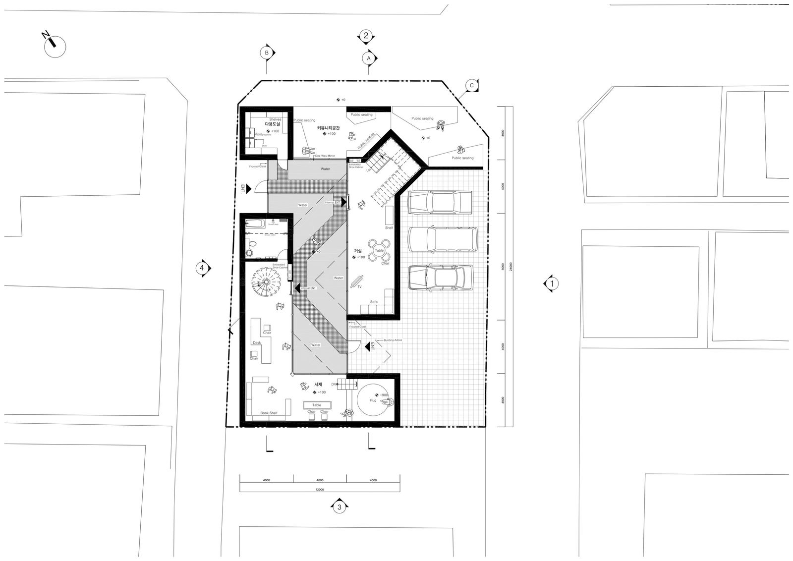 서재는 업무 공간과 책장 공간, 두 가지 형태의 책읽는 공간으로 나뉜다. 서재에 들어가면, 업무공간을 거쳐 책장을 지나야만 책읽는 공간으로 들어갈 수 있도록 동선을 고정했는데, 이를 통해 책장에서 책을 꺼내 책을 읽는 공간에서 책을 읽은 뒤, 다시 나올 때는 책장에 책을 넣고 나올 수 있도록 행동을 유도하였다. 책 읽는 공간은 2가지 형태이다. 1번 공간에서는 중정을 바라보도록 가구를 배치했는데, 때문에 여기서 중정과 그 너머의 커뮤니티 공간, 너머 건물 외부의 도로와 공원까지 한 눈에 볼 수 있도록 설계하였다. 2번 공간에서는 1m 내려가 있는 공간으로 만들었는데, 공간을 1m내린 뒤 사방을 벽으로 막고, 천창을 뚫어 이 공간에 있는 사람이 천창을 바라보도록 유도하였고, 가구는 러그 하나만 두어, 그 위에서 앉아서 책을 보거나 누워서 책을 보도록 유도하였다.