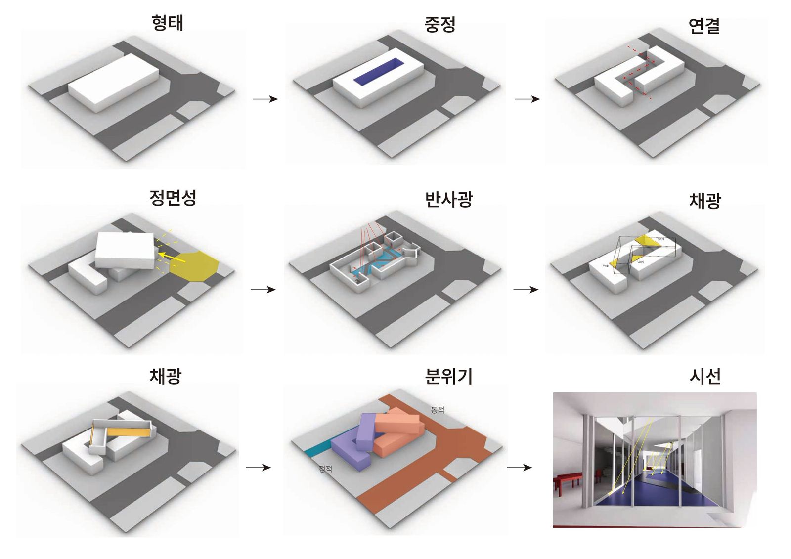 처음에 주택 설계를 시작할 때, '채광'이라는 하나의 핵심 개념을 가지고 시작하였다. 직사각형 매스를 하나 두고, 중앙을 비우거나 매스를 더하는 방식으로 채광을 고려하며 매스를 배치하였다.