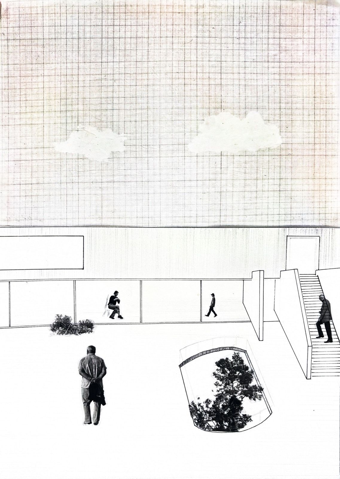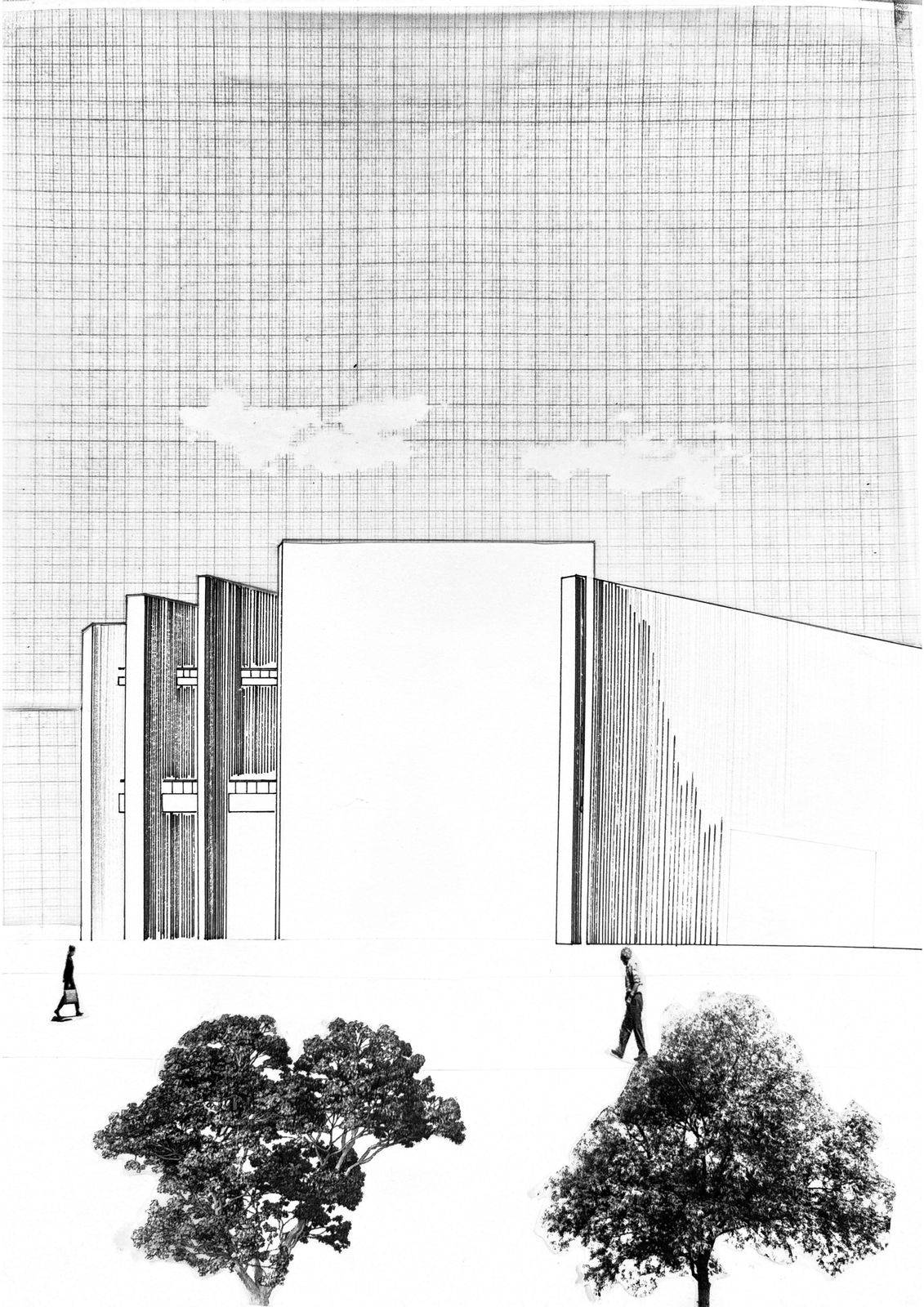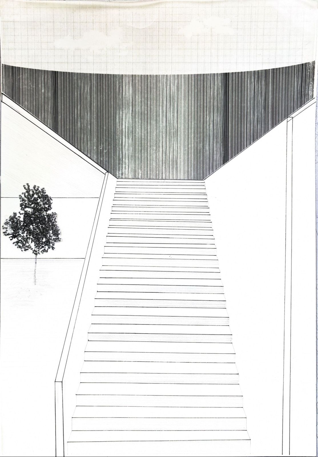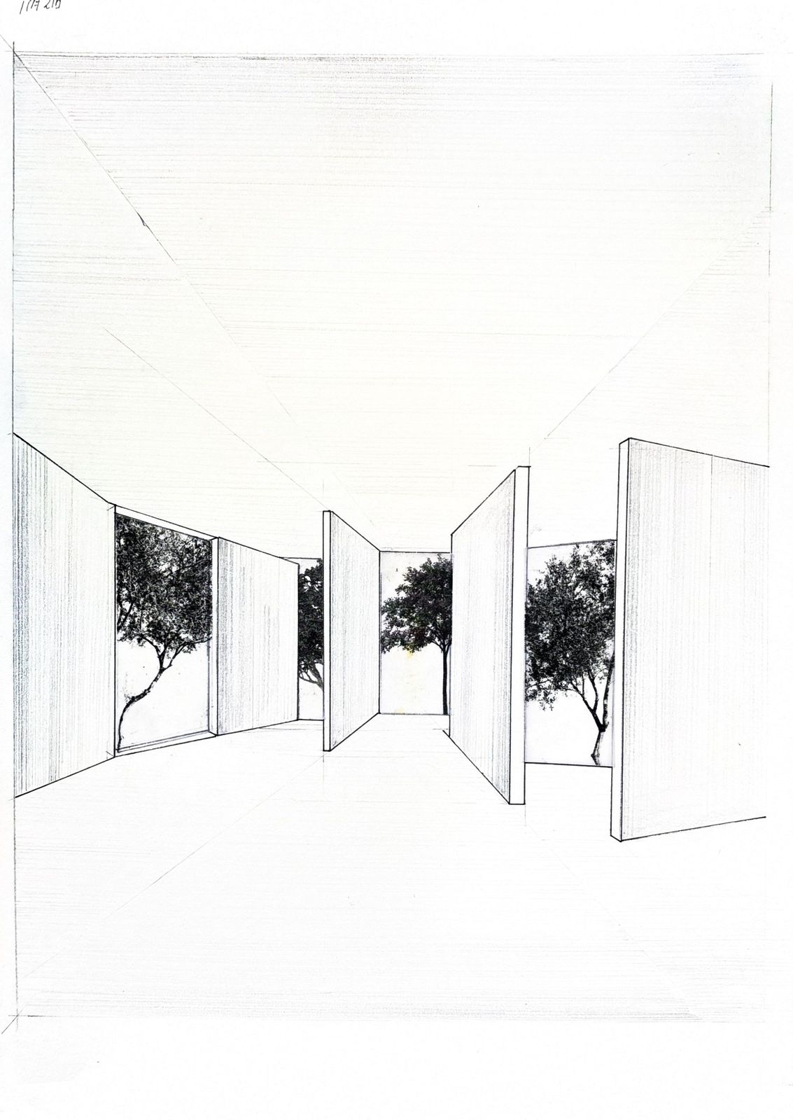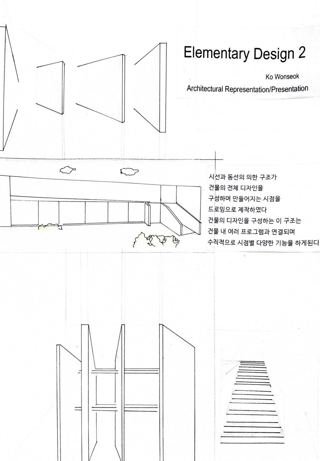 공원과 맞닿은 지점에 시선과 동선을 유도하는 강한 벽체를 세워 파사드를 구성하였다. 이 벽체를 통해 집의 디자인이 구성되며,설계에서 사용자의 시선이 주요한 요소라고 생각이 들었다. 사용자의 시점에 따라 변화하는 공간감을 표현하기 위해 주요 지점들을 드로잉으로 남겼다. 설계를 하며 의도한 시선의 흐름과 공간의 깊이를 기록하였다.
