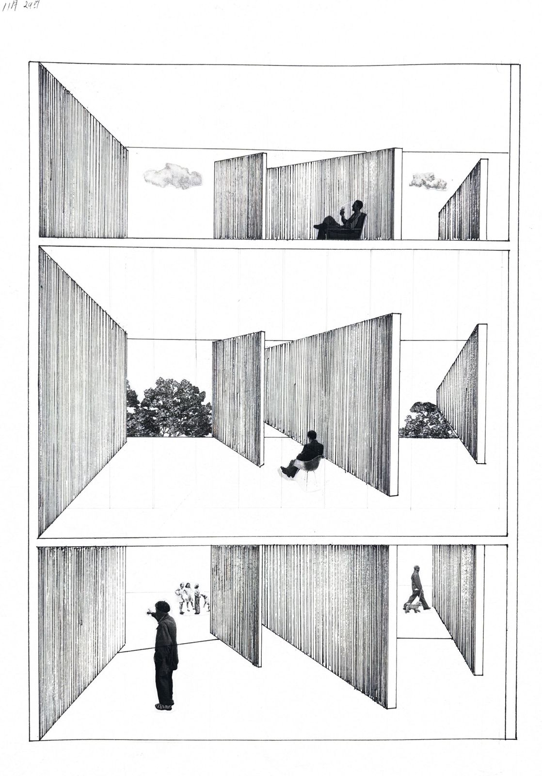 가장 중요한 이 드로잉은 실제 시점이 아닌 설계적 상상을 바탕으로 한 투시도이다 .1, 2, 3층을 동시에 관통하며 건물의 수직적 구조를 한눈에 보여주도록 구성하였다. 전 층이 동일한 구조를 공유하지만, 층별 프로그램의 연결 방식에 따라 각기 다른 기능을 수행한다.구조적 통일성 안에서 층마다 설계적 변주를 주어 기능적 차별화를 주었다.