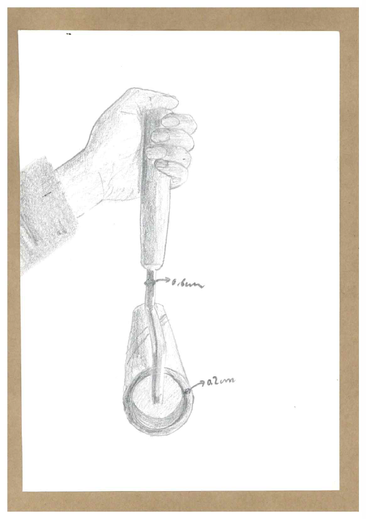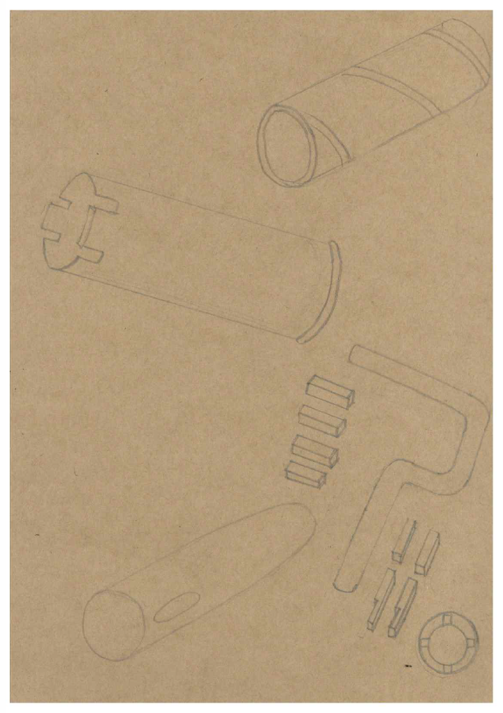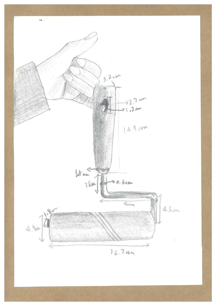손잡이의 미세하게 좁아지는 모양이나, 금속 부분을 나타내기 위한 A4종이 선정(원래 사용한 스케치북에 비해 광택이 나는 느낌이다)