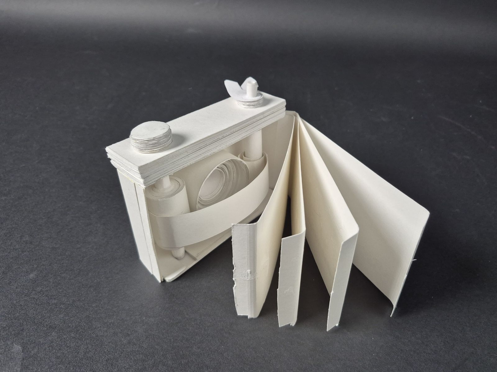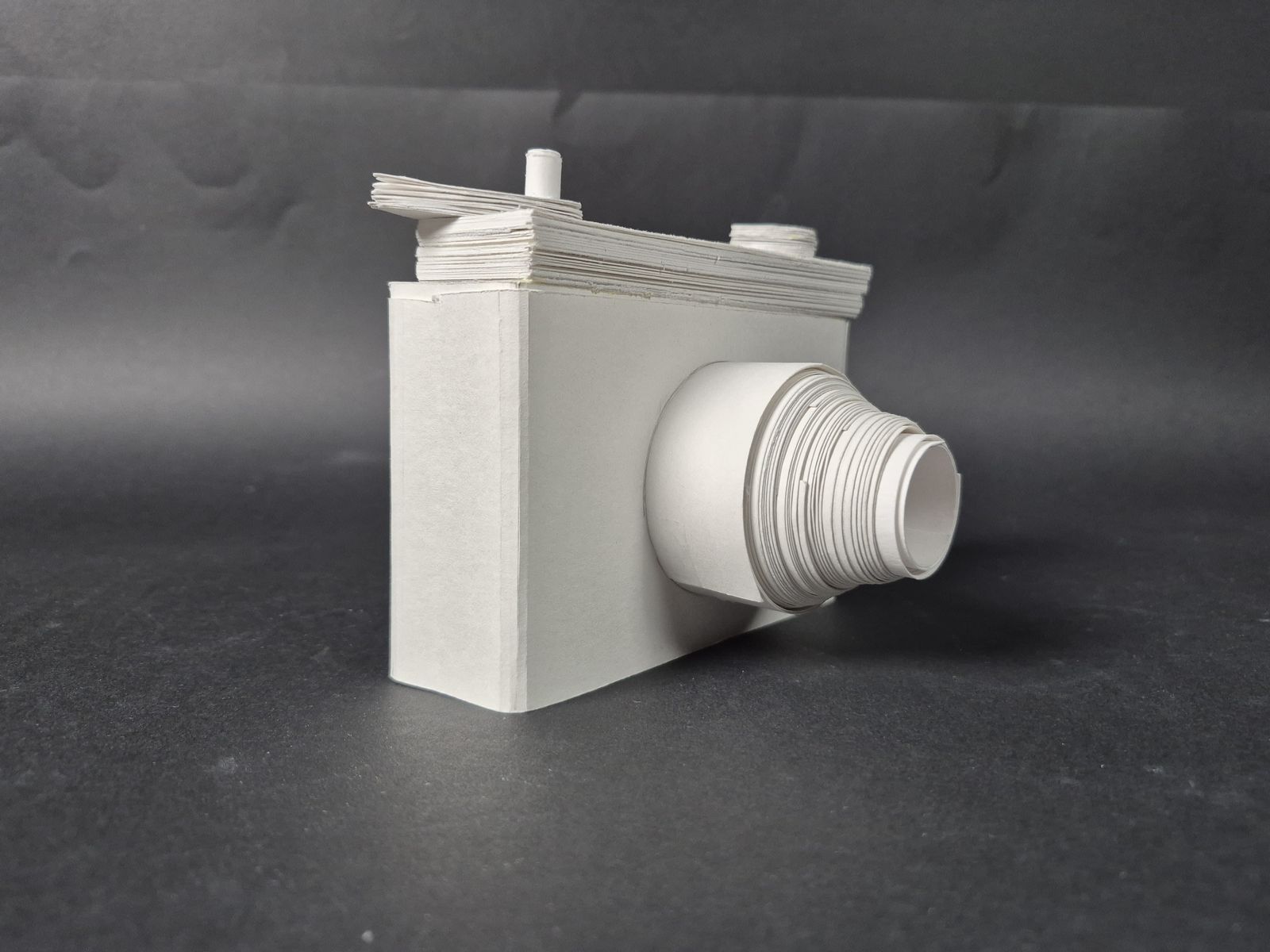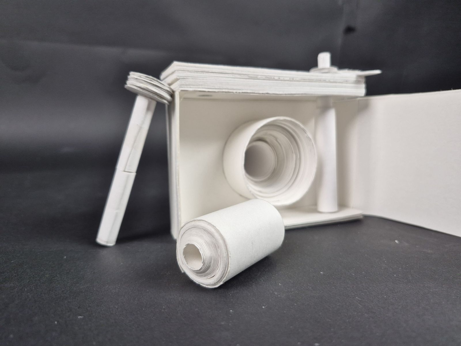야시카 일렉트로 35 필름 카메라를 '손 안의 공간' 사물로 택했습니다. 사물을 있는 그대로 재현하기 보다 렌즈-와인더-필름-덮게의 움직임에 집중했습니다. 움직임을 위해 종이를 말고 여러 겹을 쌓아 견고하게 했습니다. 무게감도 갖춰 카메라를 들고 찍는 감각을 재현하려 했습니다.