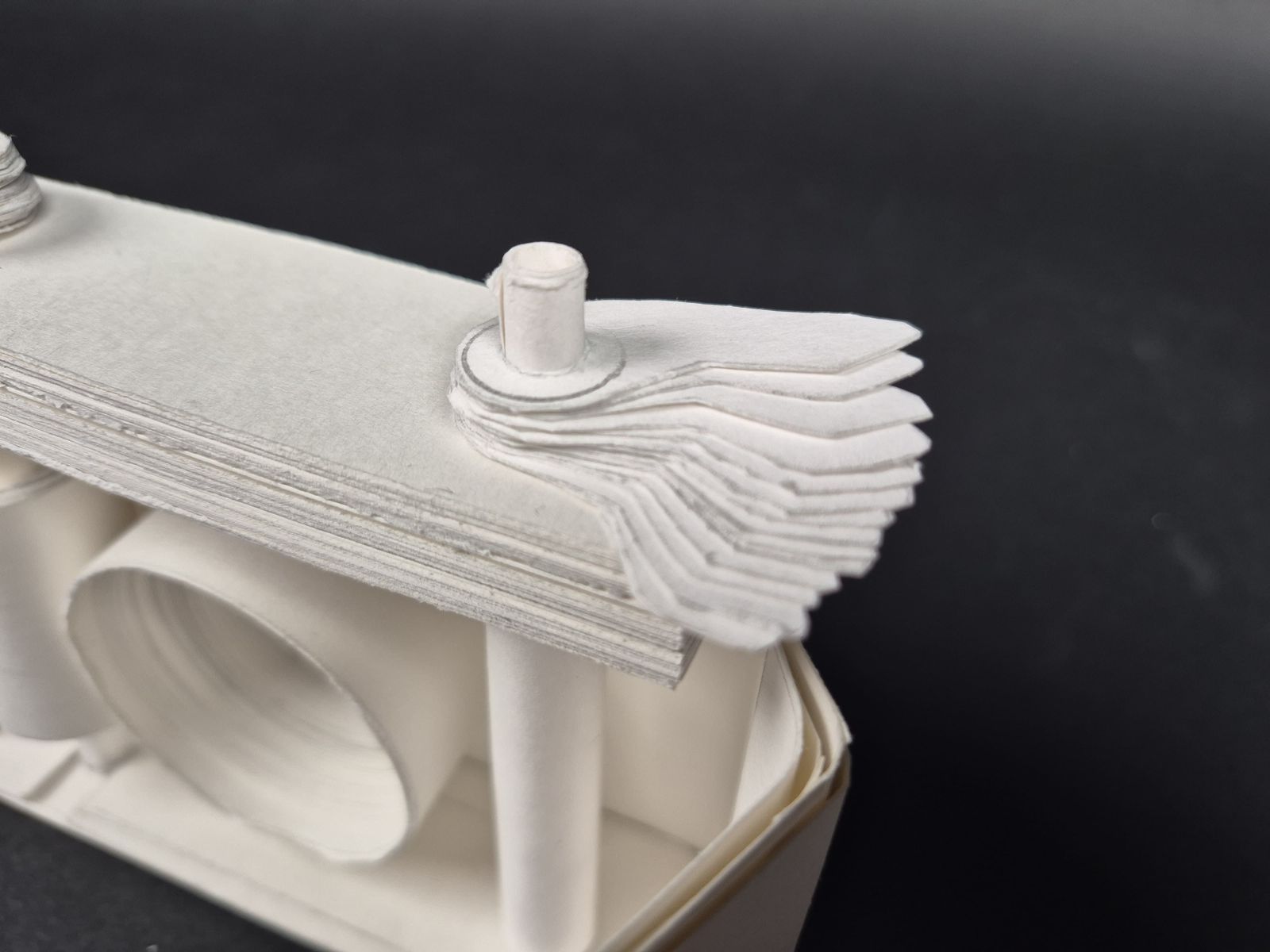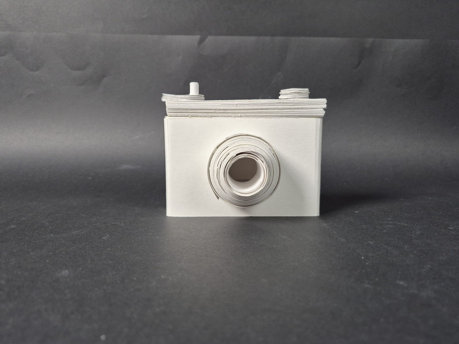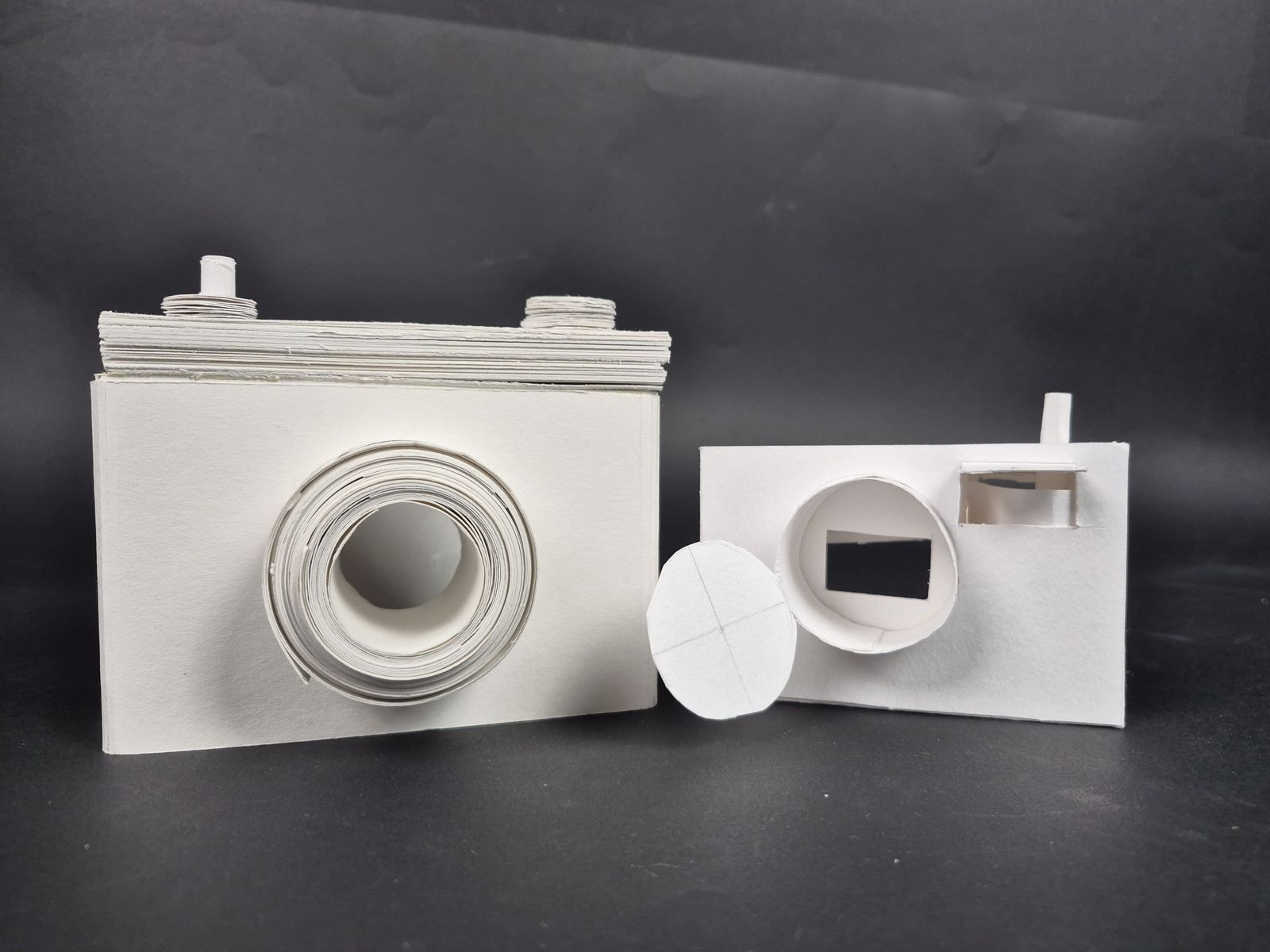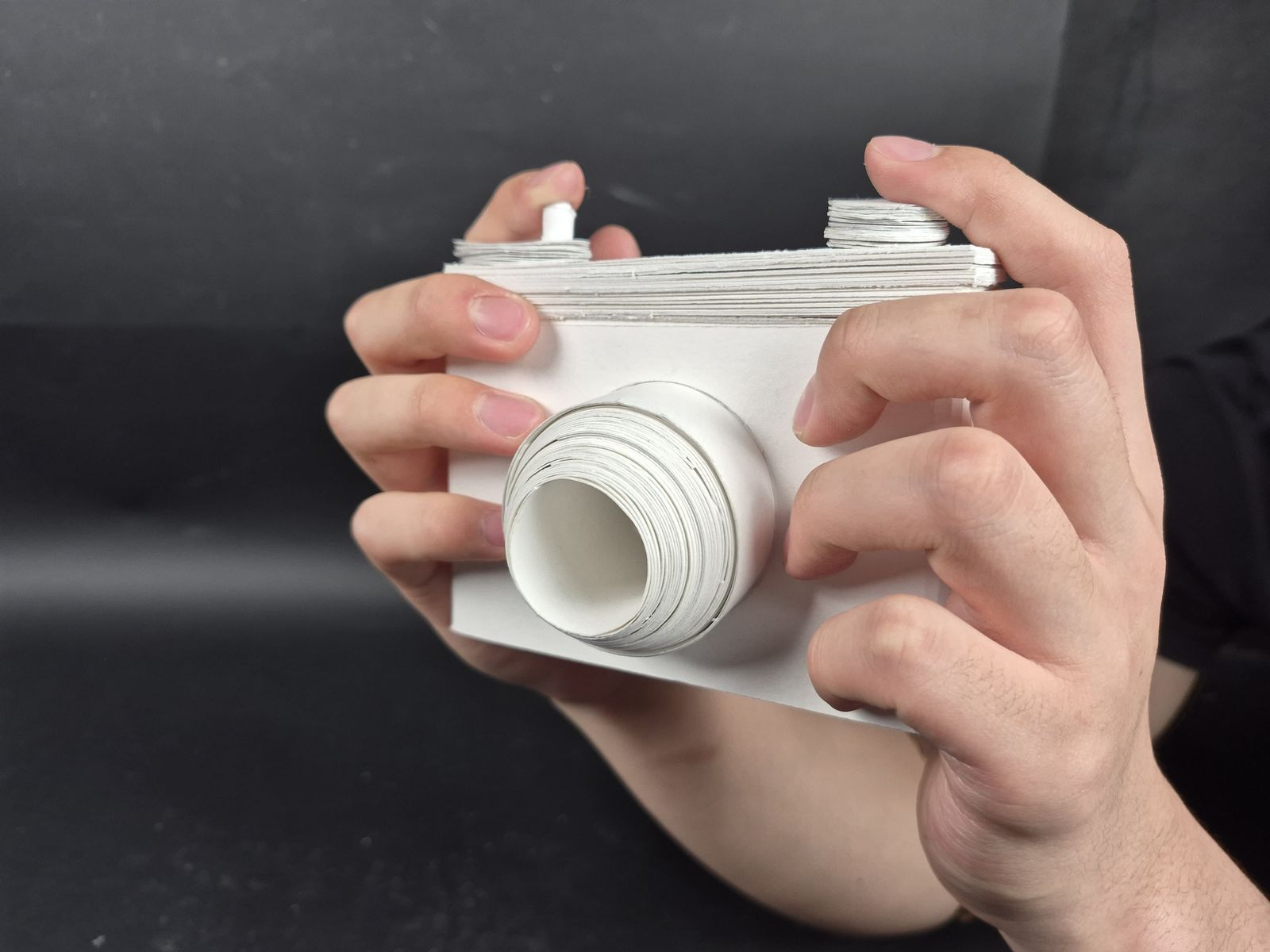 야시카 일렉트로 35 필름 카메라를 '손 안의 공간' 사물로 택했습니다. 사물을 있는 그대로 재현하기 보다 렌즈-와인더-필름-덮게의 움직임에 집중했습니다. 움직임을 위해 종이를 말고 여러 겹을 쌓아 견고하게 했습니다. 무게감도 갖춰 카메라를 들고 찍는 감각을 재현하려 했습니다.