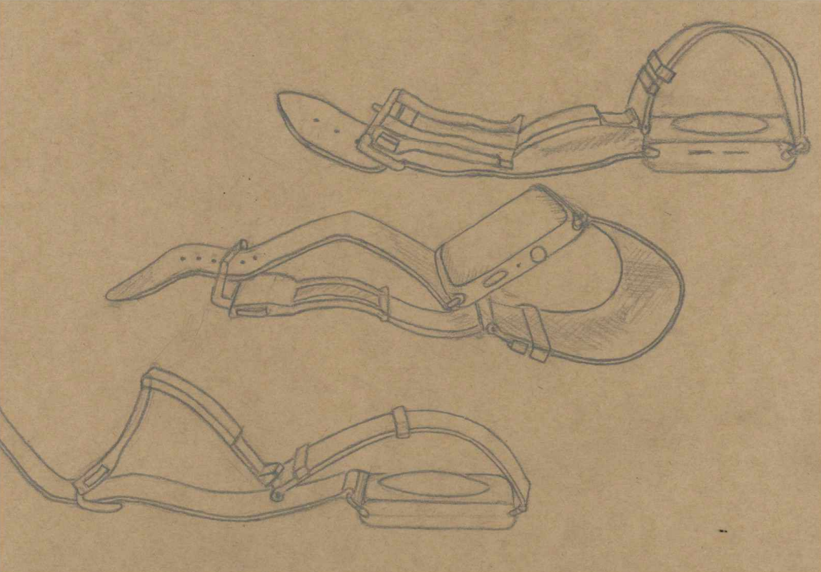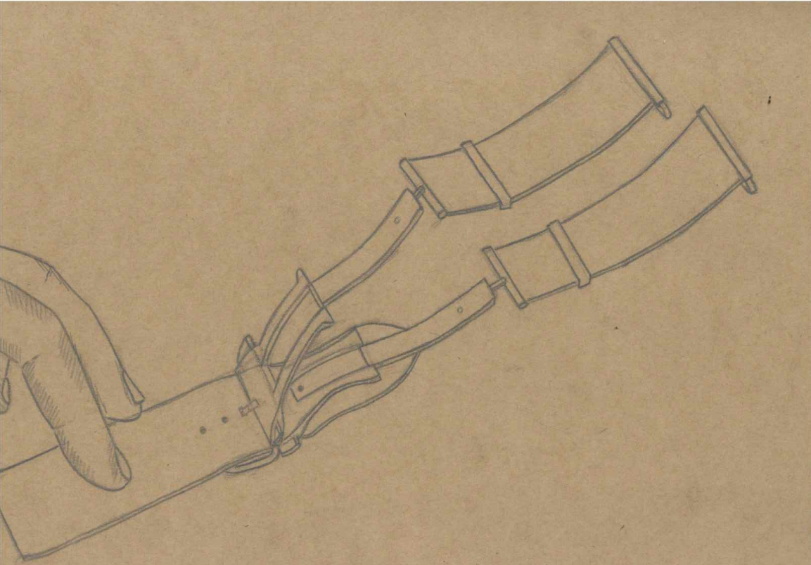 스트랩이 손목을 통과하는 과정은 단편적인 스케치로만 담아내기에 무리가 있다. 1:1 실측 모형을 직접 착용할 수 있게 제작하고 착용 과정을 영상으로 촬영했다. 이후 레이어를 여러 장 겹쳐 손목을 통과하는 스트랩의 모습을 생생하고 한눈에 보이도록 표현했다.