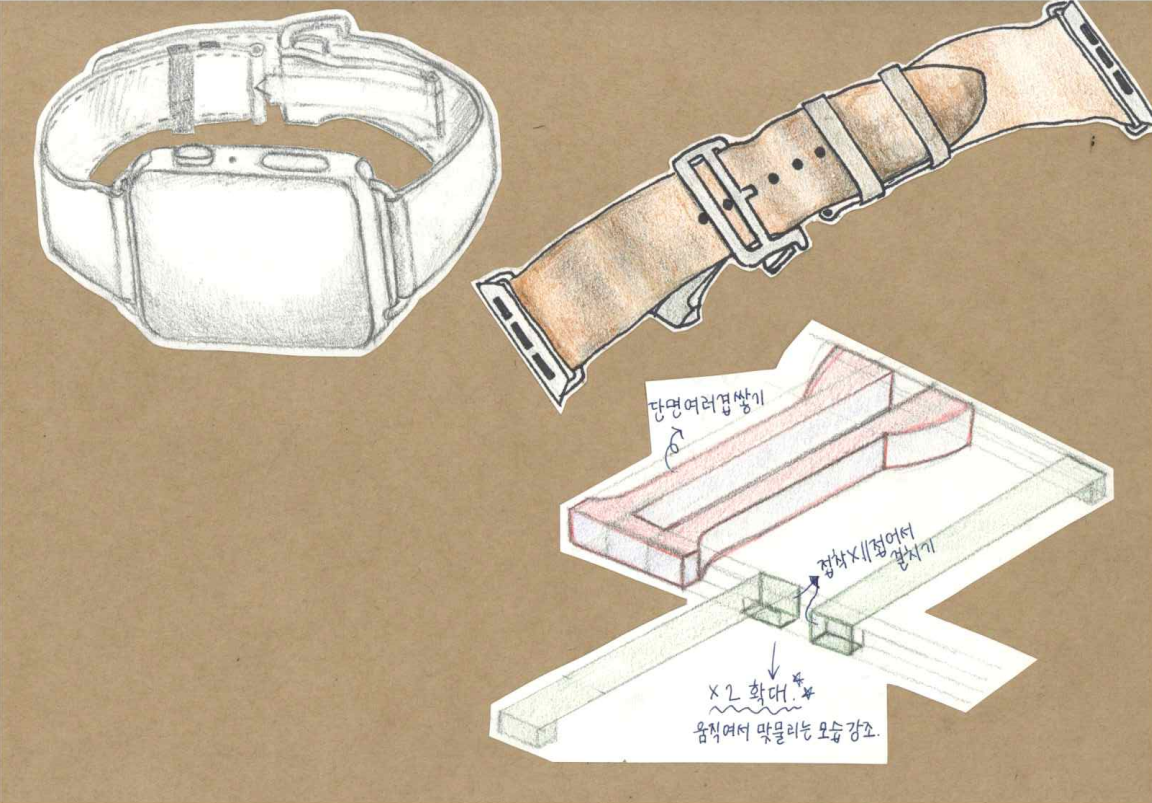 사물을 선택하는 과정에서 애플워치를 의식하게 된 것은 여타 손목시계들과는 다른 스트랩 경첩의 작동 원리였다. 위 스케치를 보면 애플워치를 기능적으로 해석하고 객관적으로 관찰한 스케치들이 대다수이다. 초반 모형도 스트랩 경첩의 작동 원리에 집중하기 위해 비교적 세세한 다른 부분들은 생략하였다.