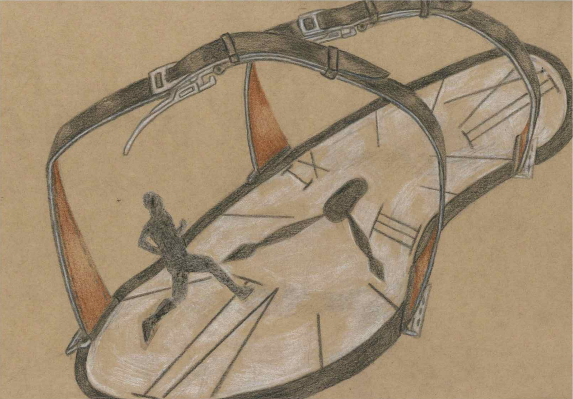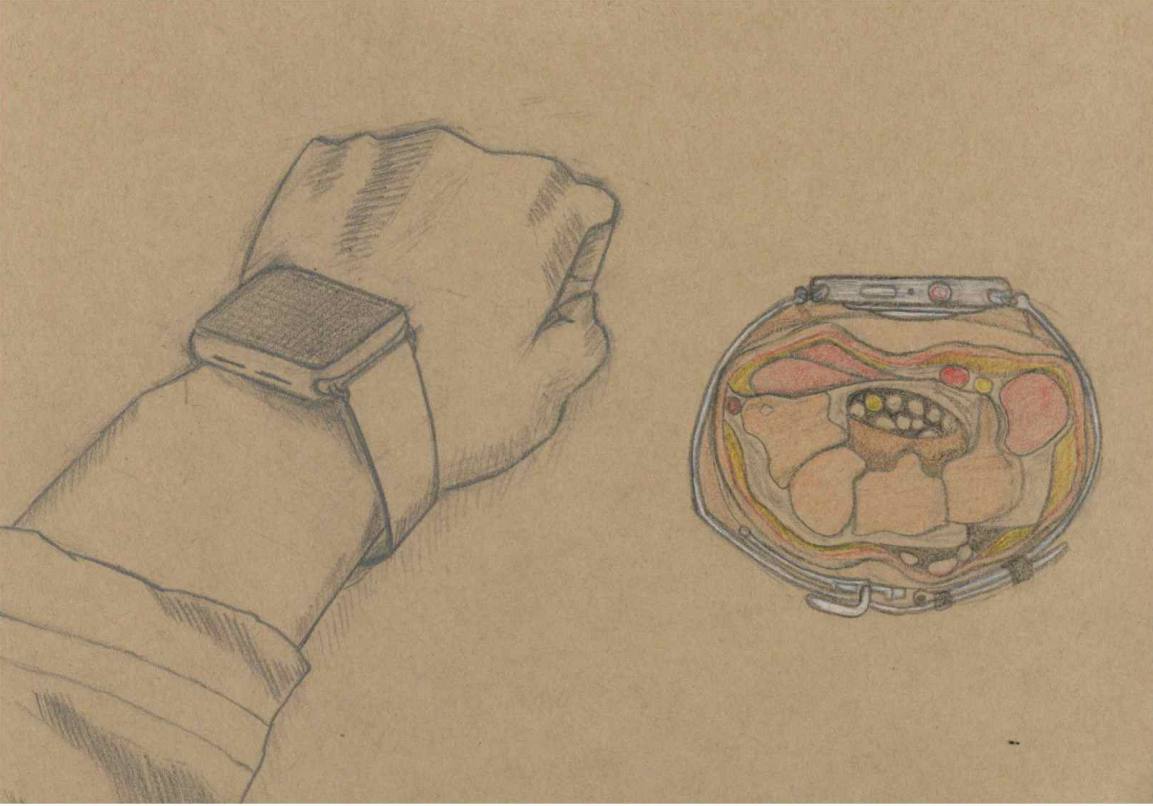 애플워치를 착용한 모습에 그치지 않고 손끝에 화면이 닿는 모습, 스트랩이 둥글게 말리는 과정에서 드러나는 내부 경첩의 모습을 한 장의 그림에 같이 그려보며 사물과 손, 공간의 관계를 탐구하고자 했다.