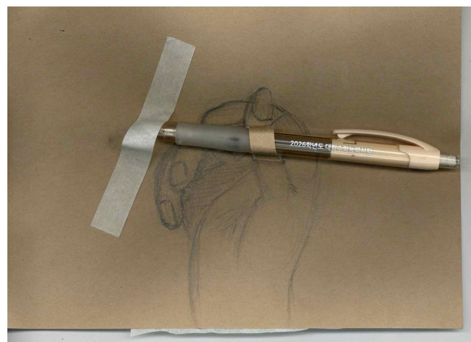 원래는 손으로 수능샤프를 쥐고있는 스케치를 하려했으나 공간에 대해 생각하다보니 평면적인 공간을 차지하기보단 좀더 입체적인 느낌을 주고싶어 손에 수능샤프를 낀 모습을 표현하게 되었다.