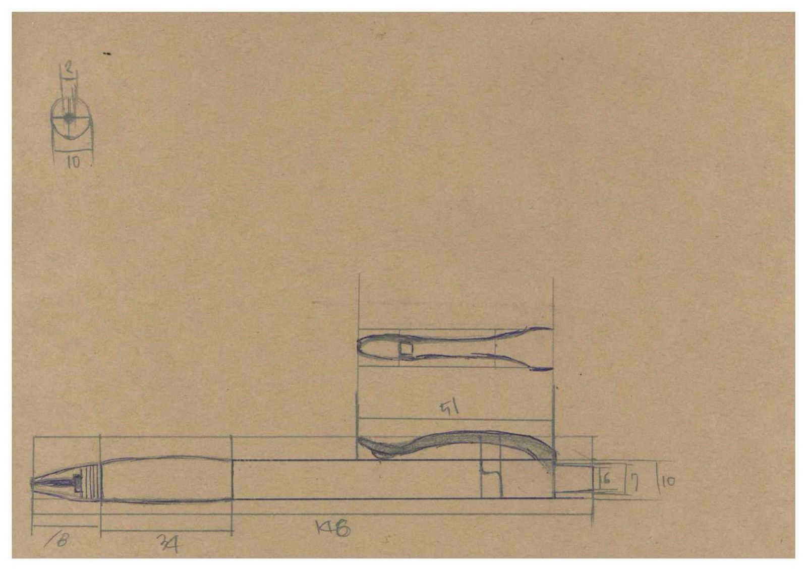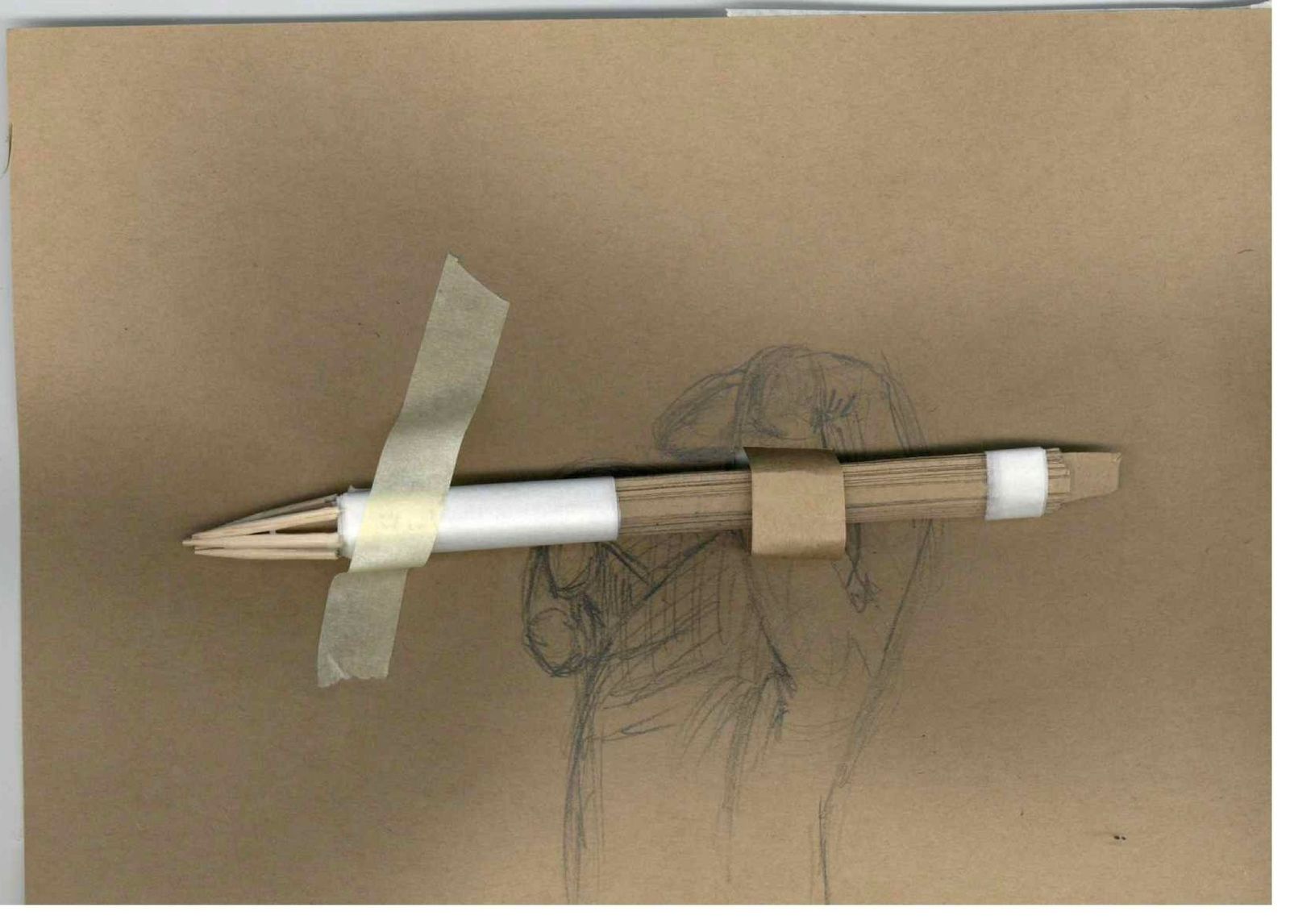 이 샤프 모형에서 입체감을 더 극적으로 주기 위해서 수능 샤프의 몸통을 하나의 종이로 만든것이 아닌 평면하나하나를 잘라붙여 등고선의 느낌을 주며 입체감을 극적으로 주고자 하였고 손으로 잡는 부분을 롤 트레이싱지로 감아 소프트한 느낌을 주고자 하였다. 앞뚜껑은 단단한 플라스틱느낌을 최대한으로 내기위해서 이쑤시개의 표족한 부분을 잘라 매끈하면서도 날카로운 느낌을 주고 최종적으로는 위에서 스케치한 모습을 다시 그림으로써 스케치를 모형으로 재표현한다라는 의도를 느끼게 하고 싶었다.