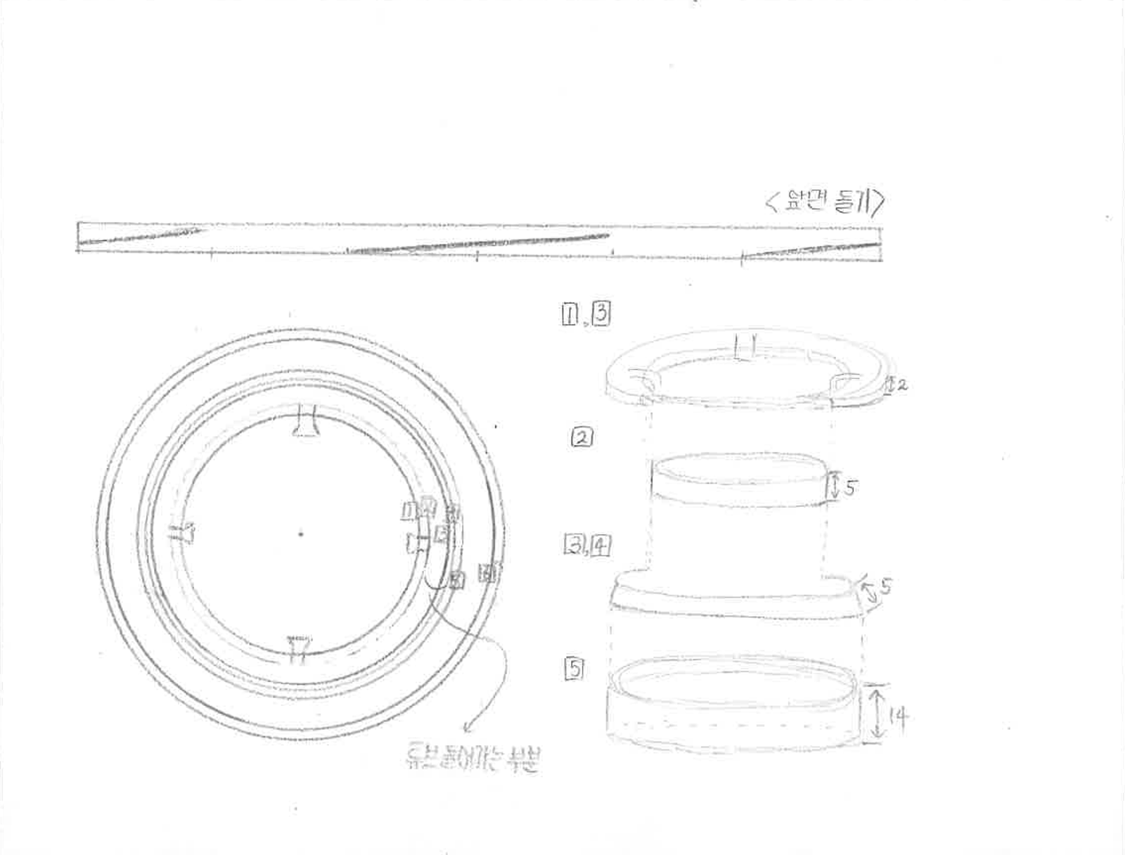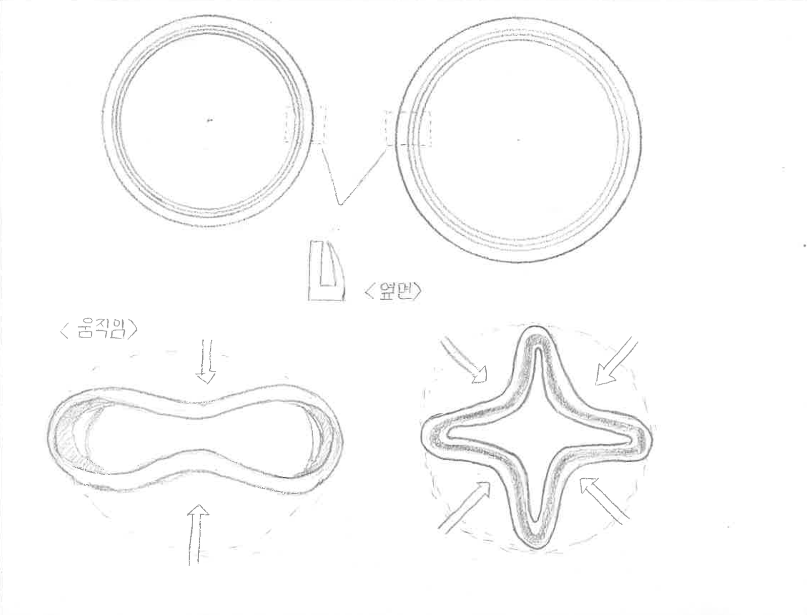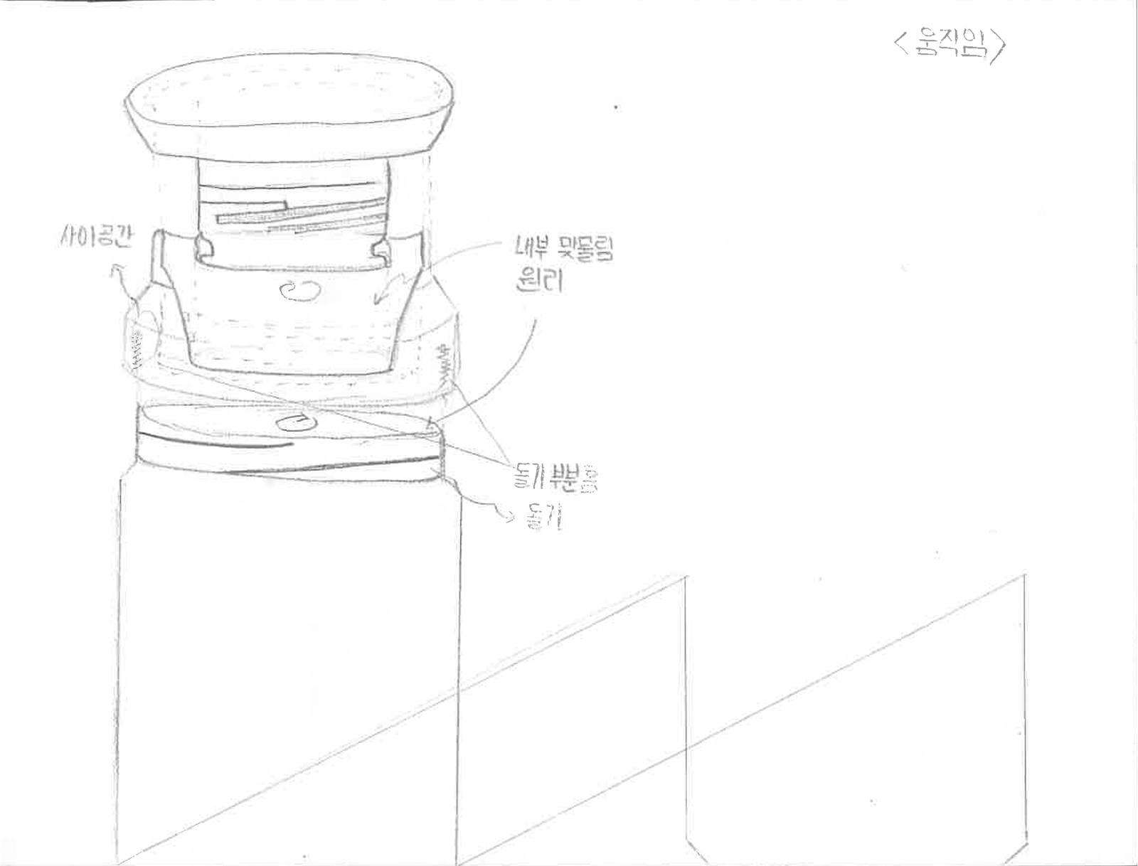 마지막으로 제가 해석 및 관찰에서 가장 중점을 뒀던 움직임입니다. 움직임을 크게 3가지로 봤습니다. 첫 번째는 직관적인 움직임, 두 번째는 돌기 부분을 통한 맞물림 마지막은 고무 튜브의 움직임입니다. 돌기 부분은 4개가 있었는데 뚜껑 부분을 목공풀을 이용해 평면으로 만들어 샘플을 만든 후 나머지를 이를 이용해 그렸습니다.