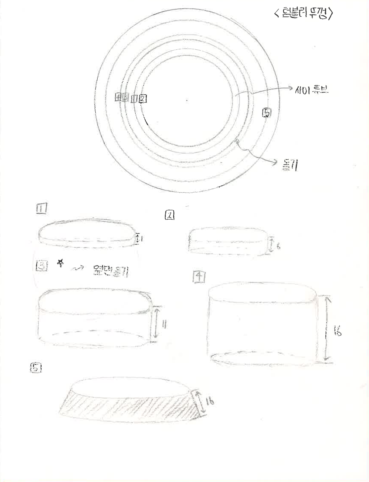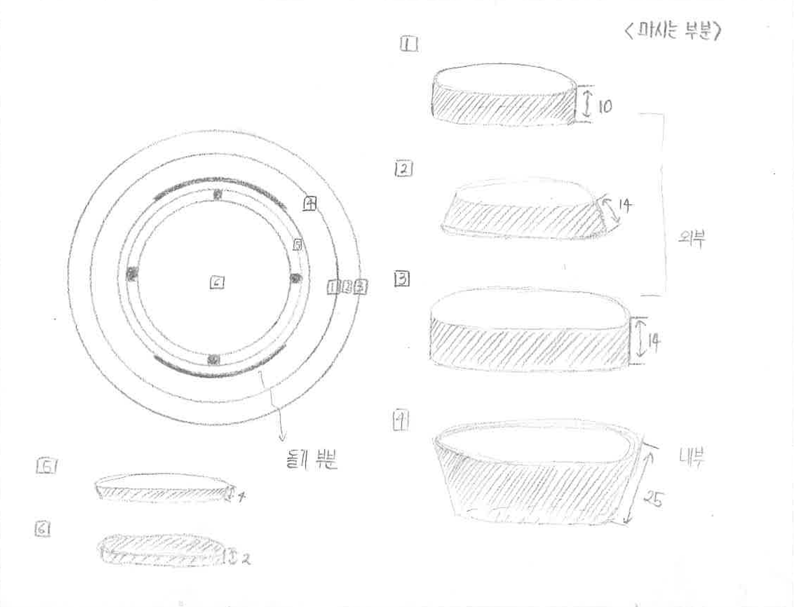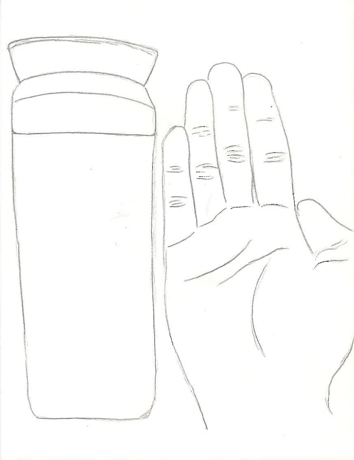 먼저 형태입니다. 저는 스케치를 하기 전에 '이것과 같은 모형을 만들기 위해서 어떤 정보들이 필요할지' 그리고 '크기를 어떻게 직관적으로 표현할 수 있을지'에 대해 고민해봤습니다. 전자는 큰 부품들에 연결되어 있는 작은 부품들간의 관계 및 치수가 필요하며 후자는 손과 텀블러의 비교를 이용해보면 좋겠다는 생각이 들었습니다. 이에 따라 손과 텀블러의 크기를 비교한 스케치를 그렸습니다. 또한 큰 부품들을 위, 아랫면에서 관찰하여 선을 그리고 각 선에 해당하는 작은 부품들을 실제 치수를 담아 입체도형으로 표현했습니다.