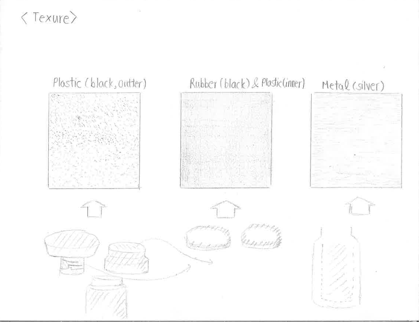 다음으로 질감입니다. 분명 손으로 만져봤을 때는 3가지의 다른 질감이 느껴졌으나 그림으로 표현해보니 차이가 느껴지지 않는 문제가 생겼었습니다. 질감을 표현하는 방식을 찾아보니 각각의 특성을 알 수 있었고 이를 스케치에 담았습니다. 까칠하다고 생각한 부분은 많은 점으로 매끈한 고무, 플라스틱 부분은 가로, 세로선으로 메탈 부분은 가로선으로 그렸습니다.