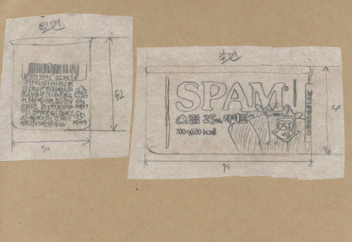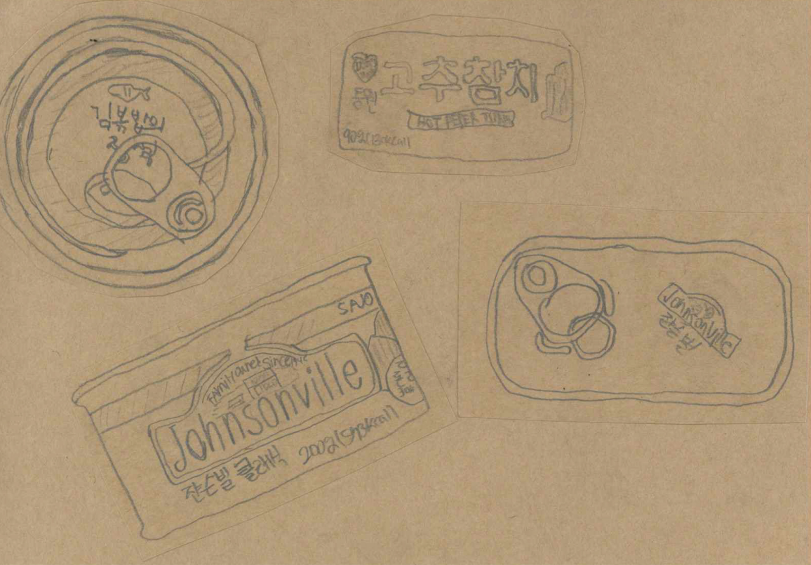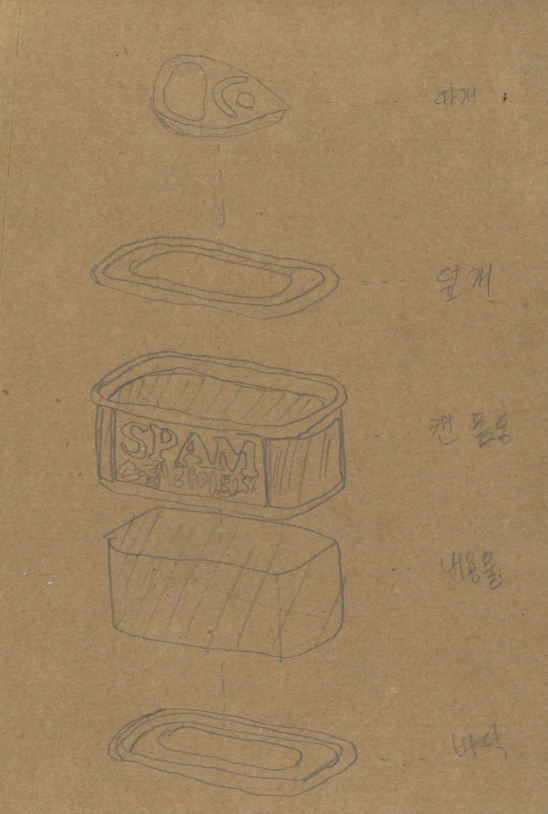 스팸과 유사한 개폐 방식과 규격을 가진 사물들을 스케치하며, 규격화된 금속 캔들이 공통적으로 공유하는 '닫힌 내부 공간'의 질서와 구조적 메커니즘을 발견했다.