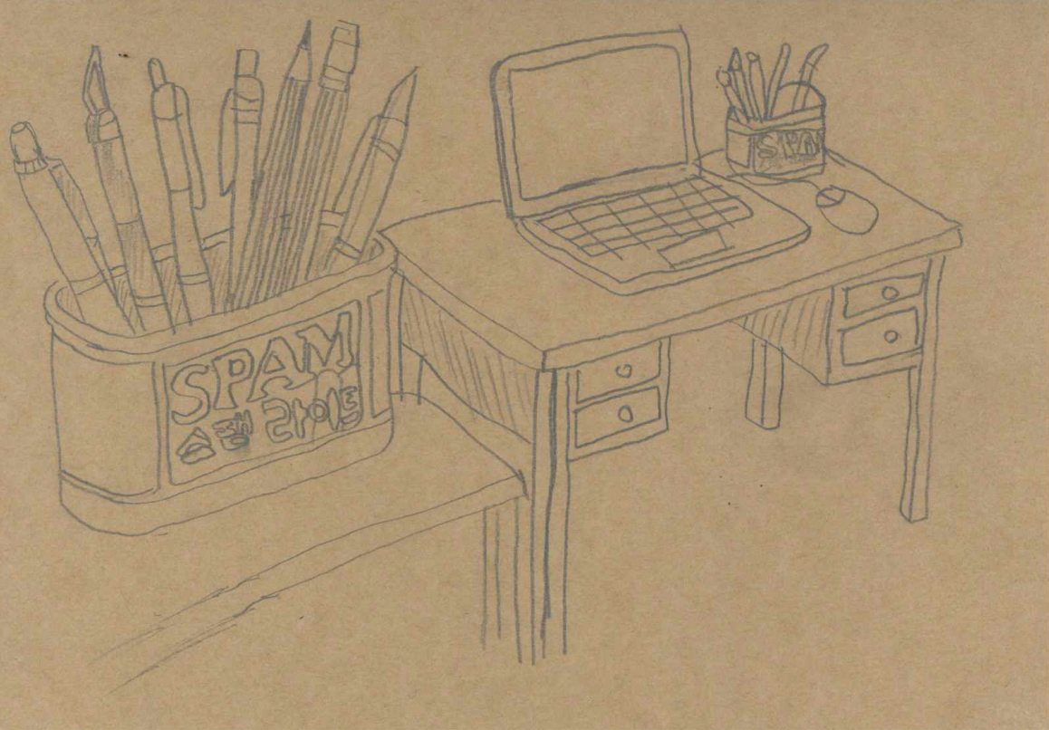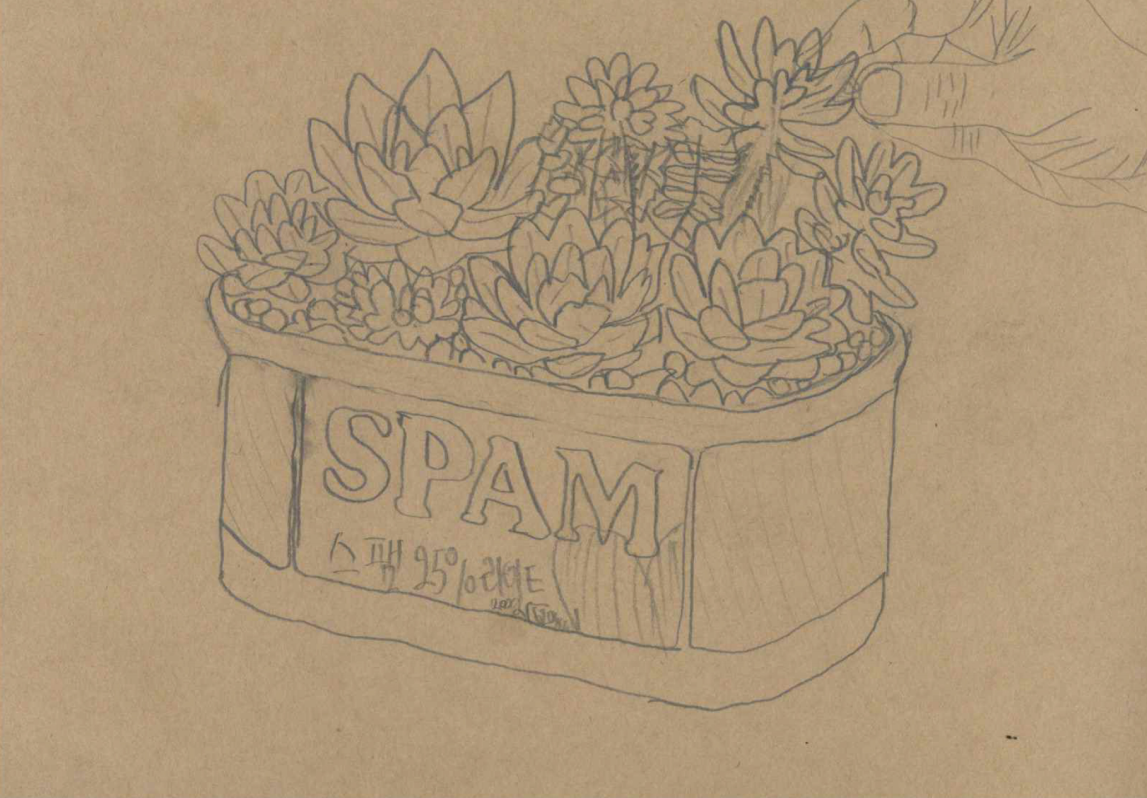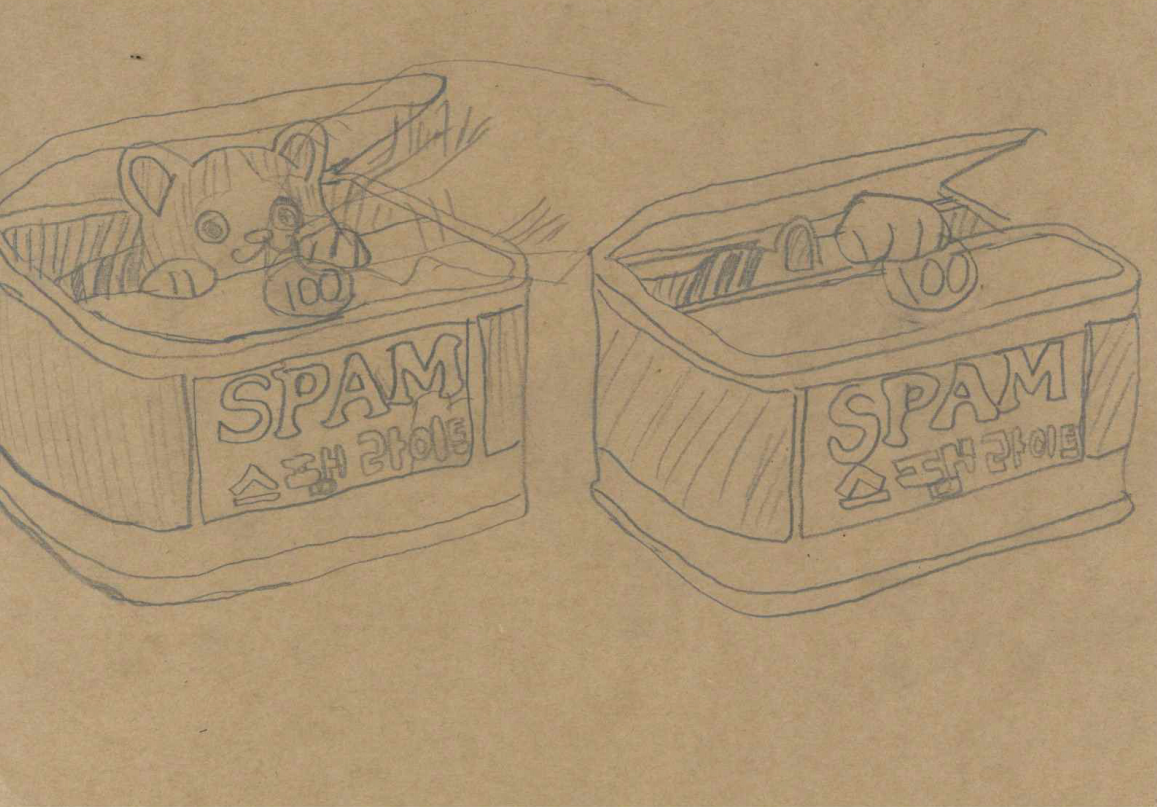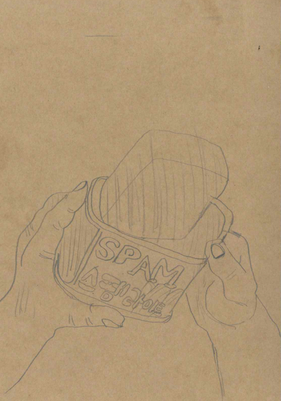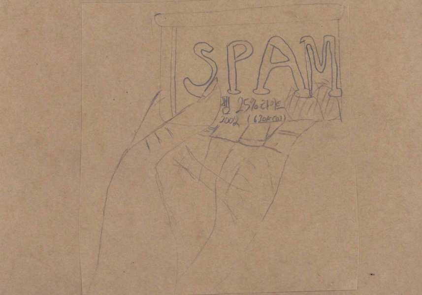 우리는 보통 스팸을 꺼낼때 뒤집어서 꺼내는 경우가 많다. 그래서 캔을 뒤집어 스팸이 나오는 찰나를 스케치로 그려보았다