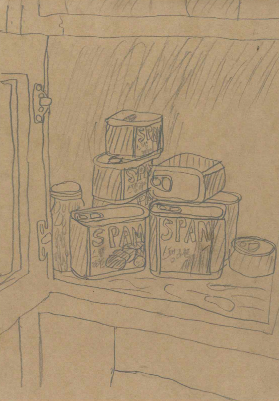 찬장 선반에 쌓인 여러 개의 스팸 캔을 그렸다. 캔과 캔 사이의 미세한 틈새와 전체적인 부피감이 만드는 좁은 공간의 새로운 질서를 발견했다.