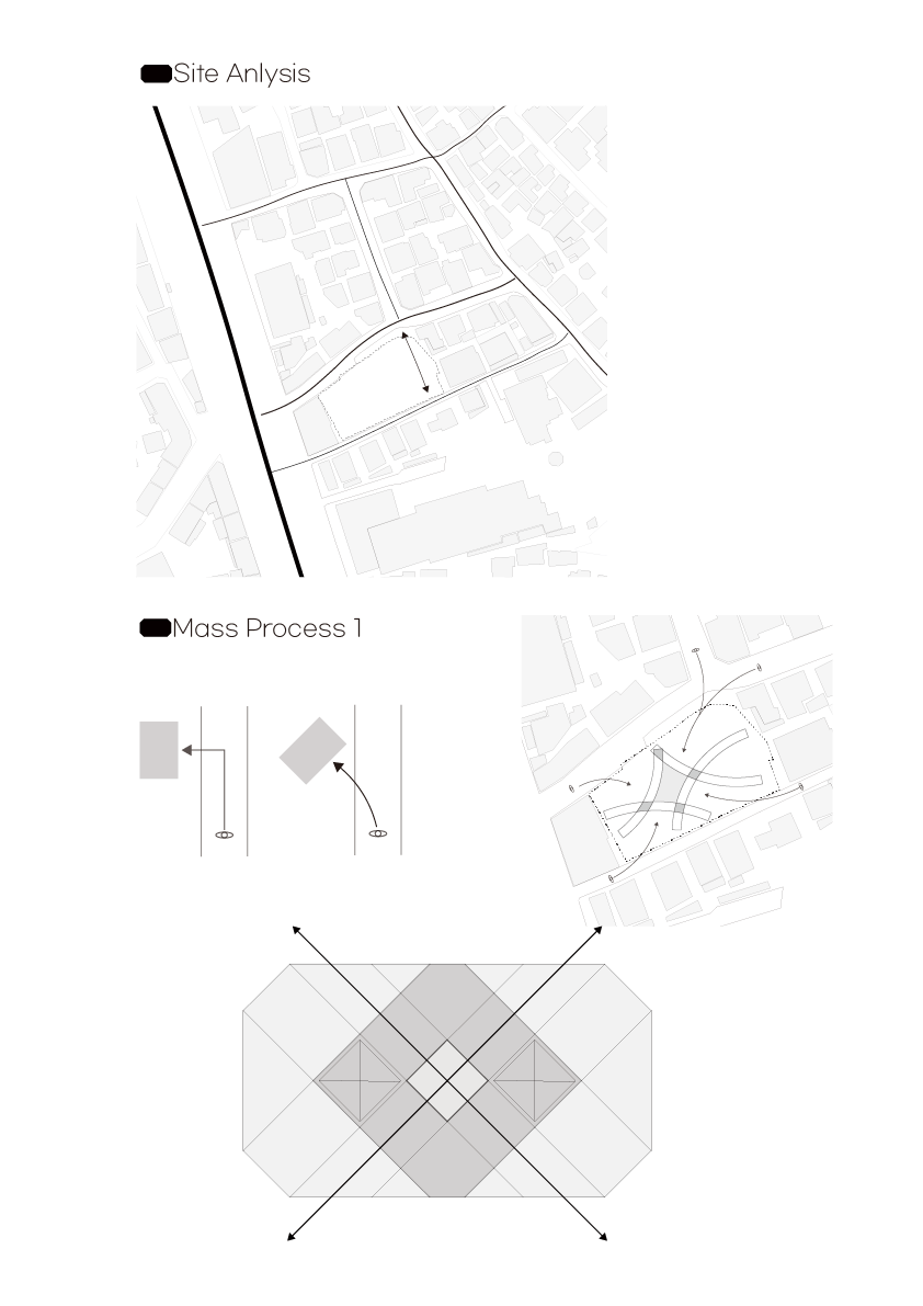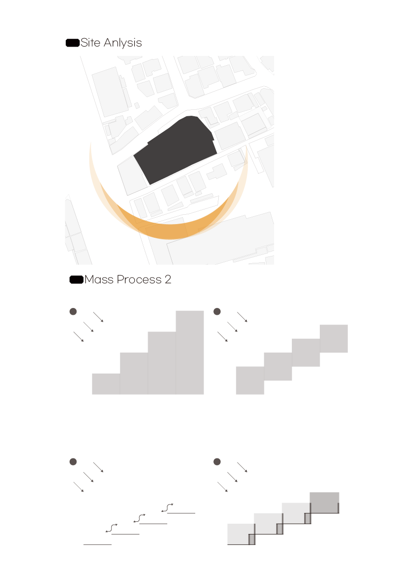 빛을 최대한 많이 끌어들이기 위해서는 복층처럼 층층이 올라가는 구조로 만들어져야 한다고 생각했다. 따라서 건물의 슬라브를 동서남북, 4개로 나누고, 4개의 슬라브가 1개층씩 이루면서 올라가도록 구성했다. 건물에 메스또한 이러한 프로세스를 반영해 1개층씩 들어올린 형태로 디자인해, 지상층에서 2개층, 3개층, 4개층 높이의 각기 다른 느낌을 주는 입구와 야외 공간을 만들고자 했다.