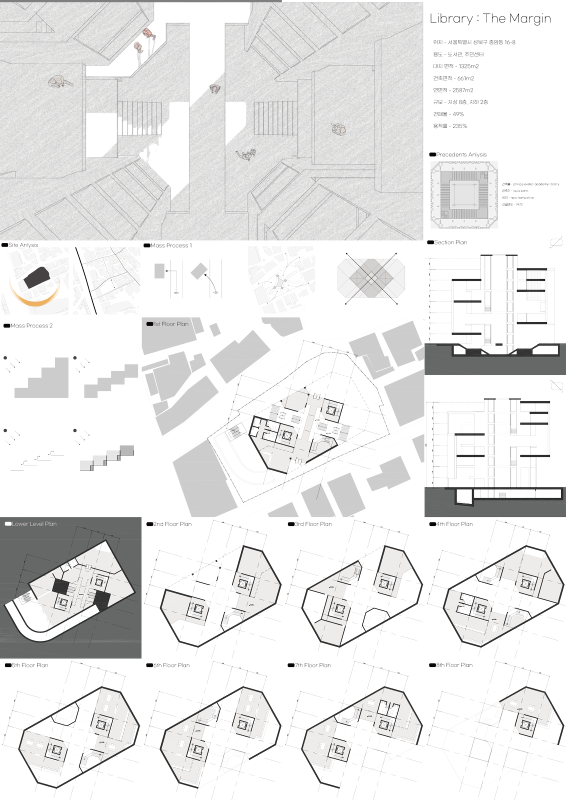 따라서 어느 방향에서든 들어오고 나갈 수 있는 사선으로 된 메스를 구성하고, 건물 자체가 길로써 활용될 수 있었으면 했다. 또한 메스의 중앙에 전층을 연결하는 아트리움을 구성해, 도석한과 주민센터 간의 노출과 연결을 강화시키고자 했다.