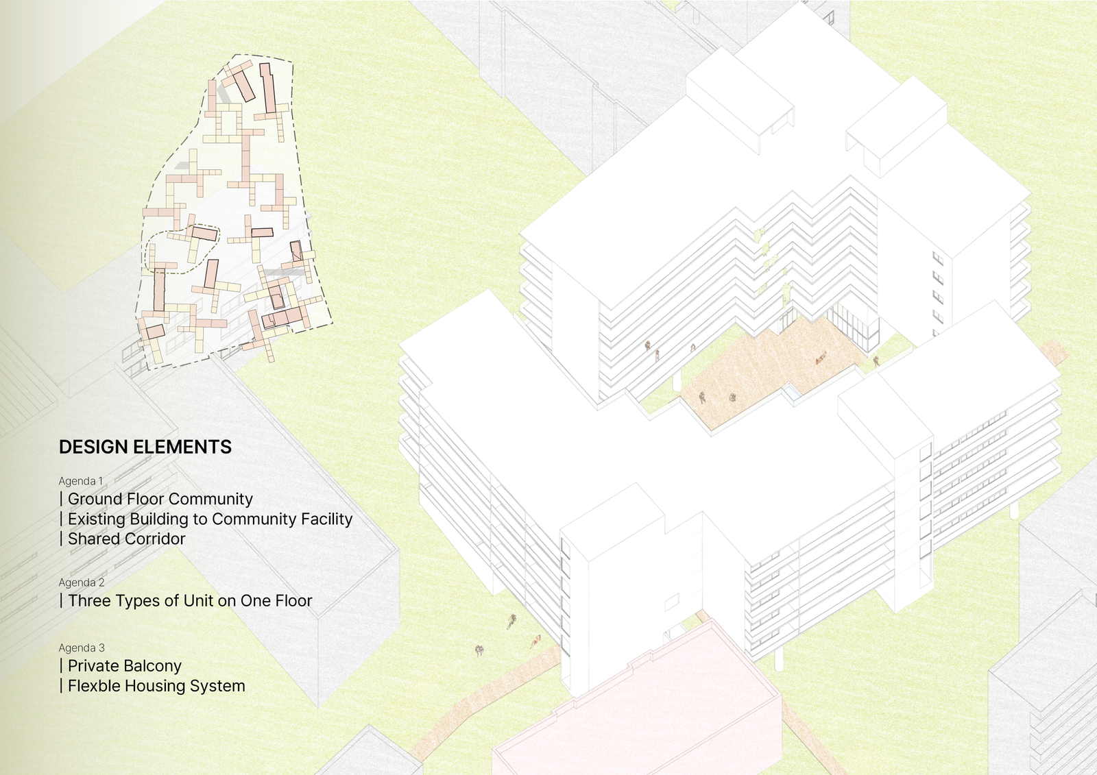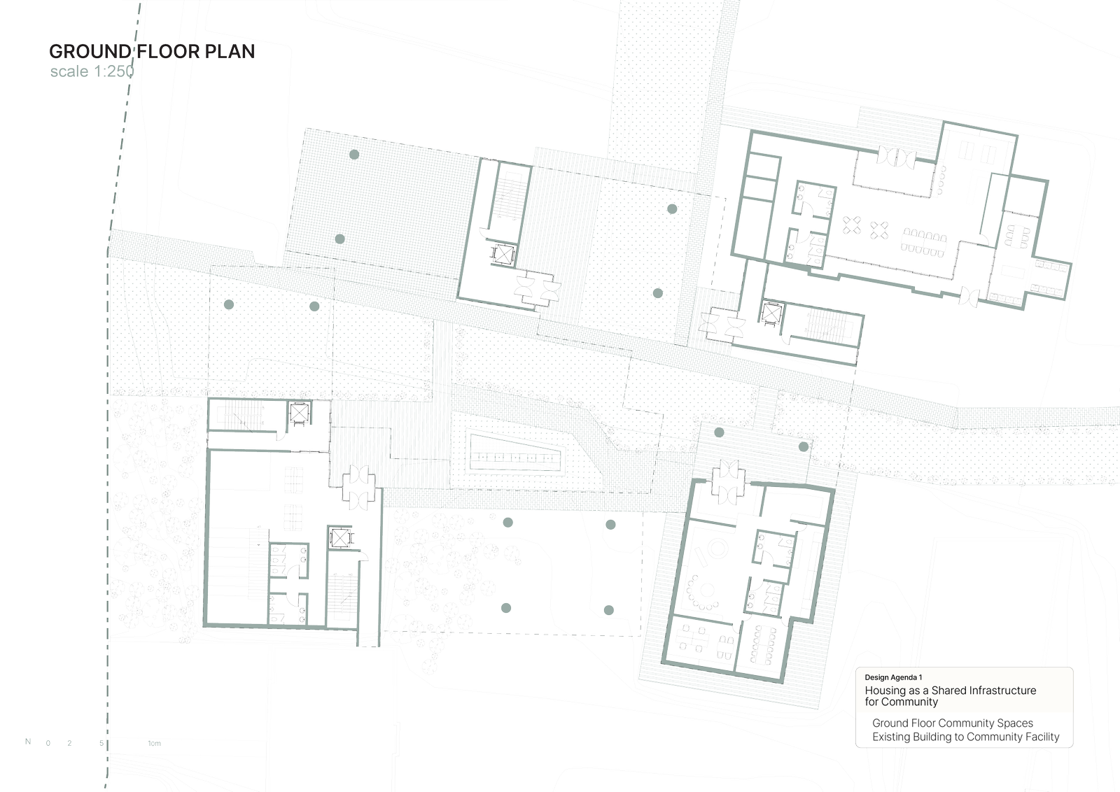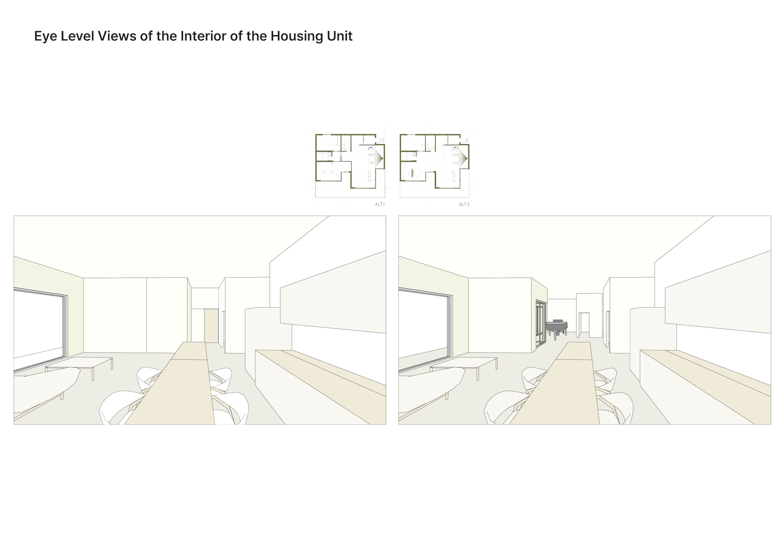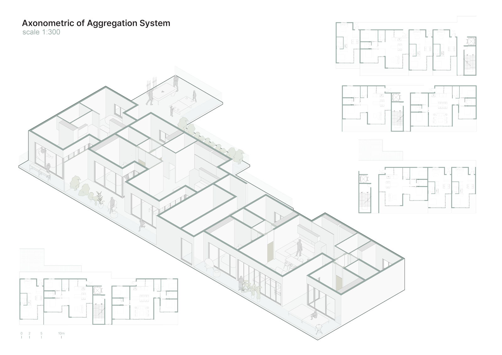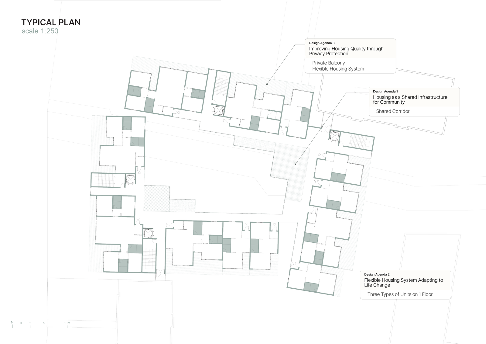 This drawing shows how units are connected. Some buildings have a central core, while others have a core at the edge to create buffer space.