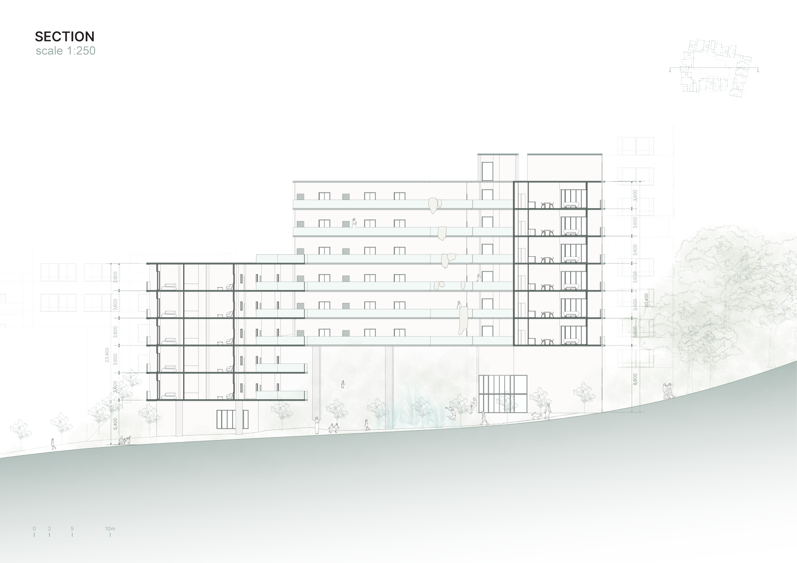 This section shows the relationship with the sloped site and Baebong Mountain. Also you can see how people use the central plaza.