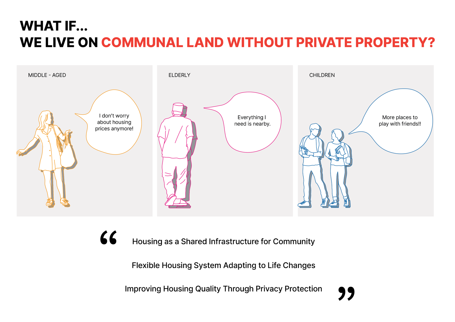 We worked on the scenario that the private ownership of real estate has disappeared and reestablished as a public resource. These personas point out living quality rather than economic value.