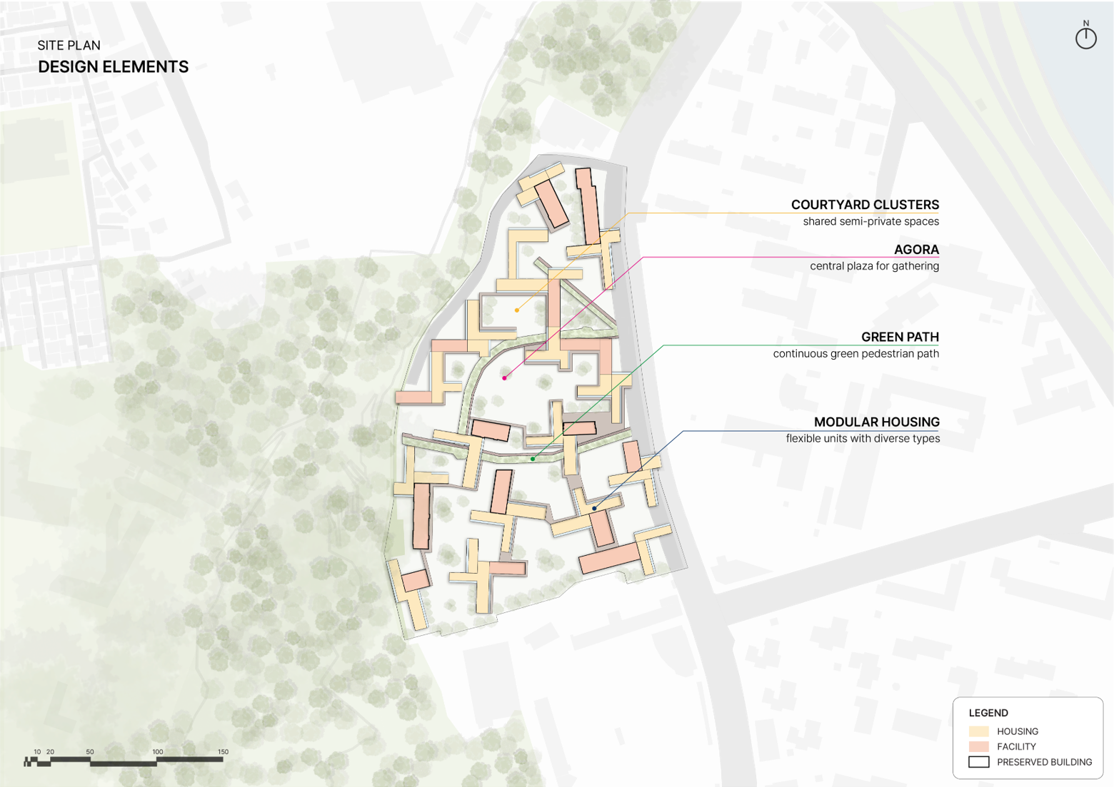Our plan is shaped by five design elements. The Agora is the central plaza and green path forms the pedestrian path.