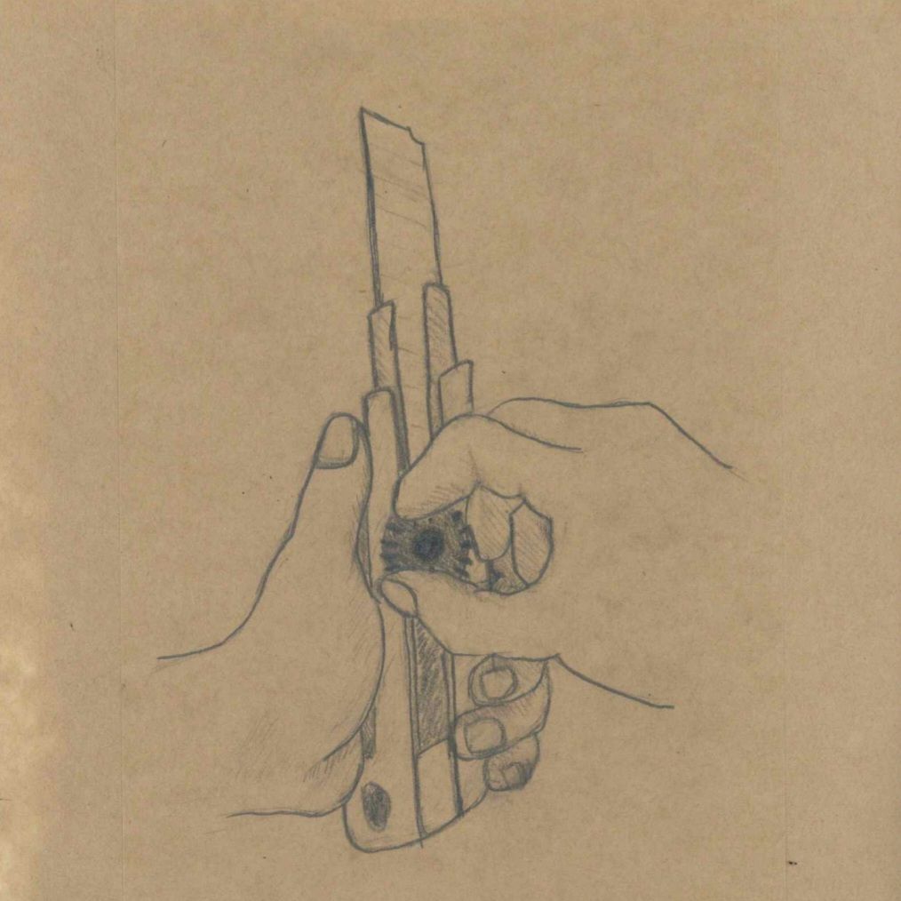 두 번째 단계에선 커터칼을 사용 중인 두 모습과 마치 ct처럼 커터칼의 단면도를 각 부위별로 그렸다.