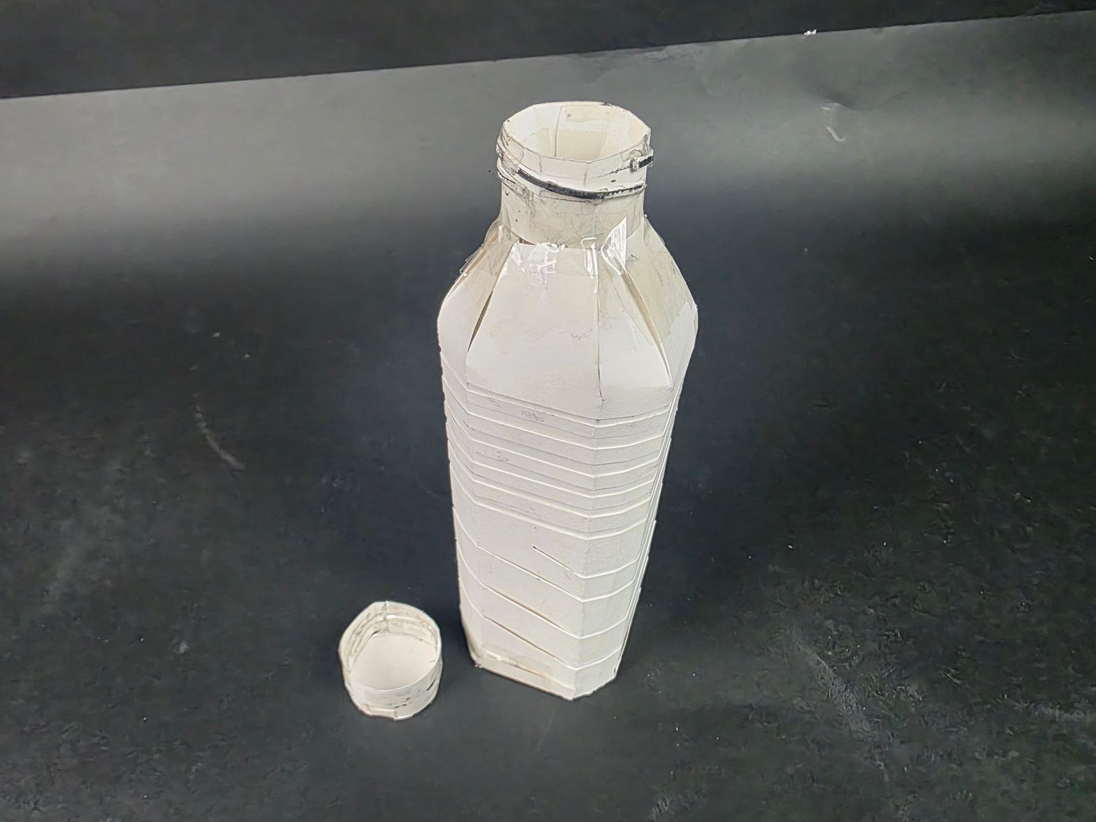 그러나 뚜껑이 문제였다. 병 입구와 뚜껑의 나선형 모양 나사산을 표현하는 것이 쉽지 않았다. 병 입구와 뚜껑에 나선형 모양으로 칼집을 내고 종이를 끼우는 방식으로 만들어 보았으나 조잡하고 내구성이 약했다.