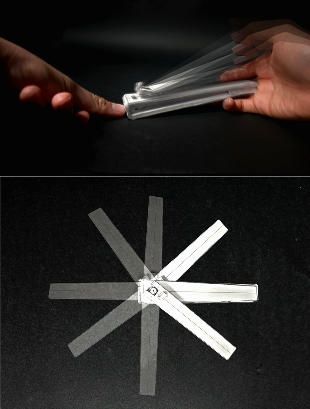 닫힌 상태에서 시작하여 손잡이를 들어 올리고 회전하며 손톱깎이를 사용할 수 있는 모습으로 변하는 순간까지의 흐름을 연속적으로 기록하였다.