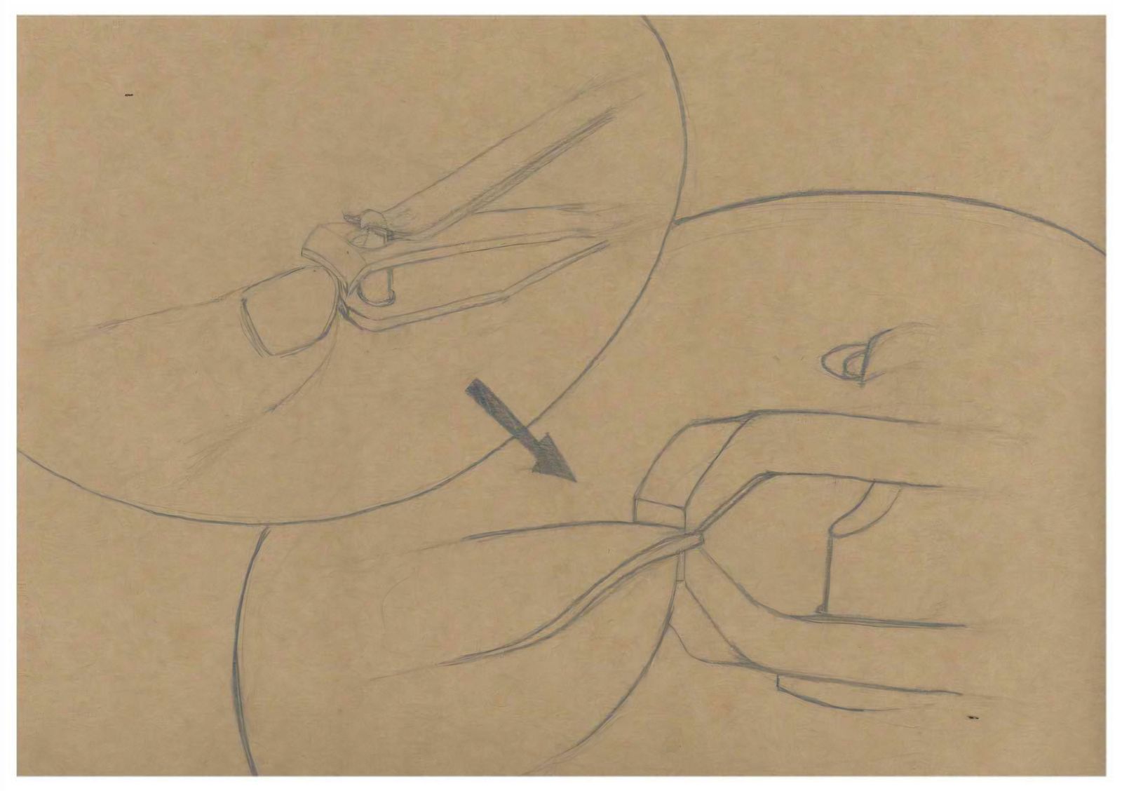 내가 발견한 손톱깎이의 두 번째 특징인 작은 힘을 증폭하여 큰 힘을 만들어낸다는 것을 표현하기 위해 스케치를 진행하였다. 먼저 손톱이 실제로 절단되는 순간을 확대하여 스케치함으로써 매우 작은 영역에 강한 힘이 집중되는 모습을 드러내고자 하였다.