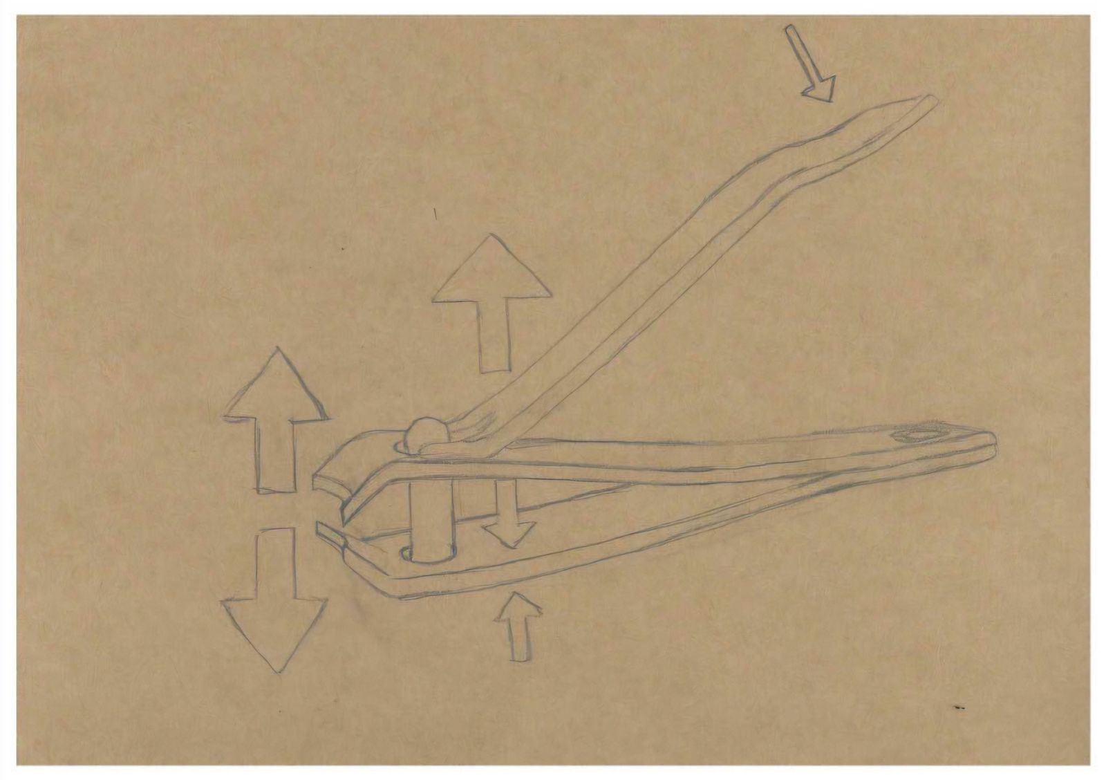작은 힘이 증폭되어 큰 힘으로 전달된다는 점을 보다 직관적으로 드러내기 위해 손잡이 끝부분은 작게, 날 부분은 크게 과장하여 스케치하였다. 이를 통해 입력되는 힘과 출력되는 힘 사이의 차이를 시각적으로 강조하고자 하였다.