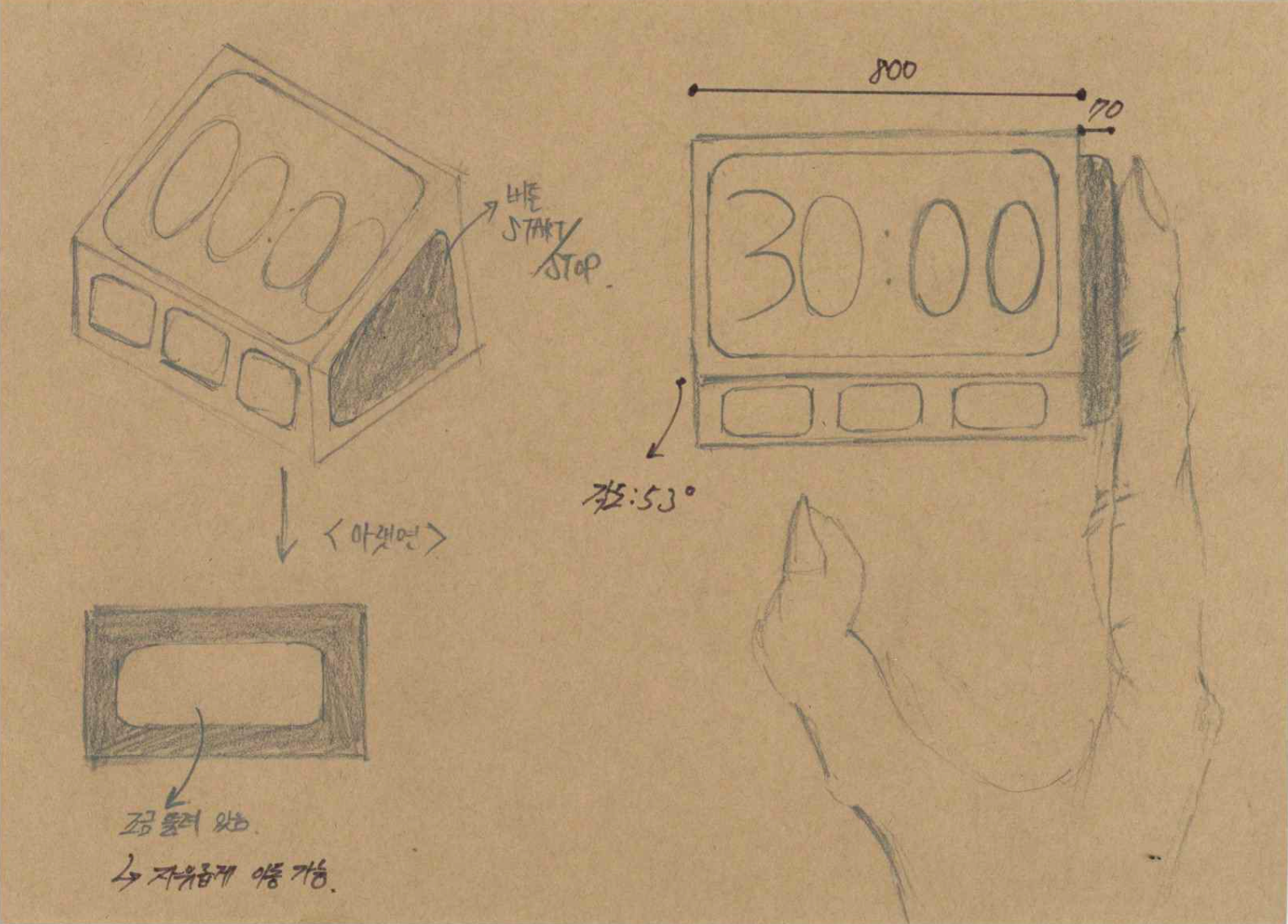 책상 위 : 가장 중요하게 파고든 나의 실제 환경이다. 완전 몰입 상태(모의고사 시험지 기준 42도 시야각)에서, 펜을 내려놓고 스톱워치를 누르는 순간(50도 시야각, 팔의 뻗음 600mm)은 섬세함을 요구한다. 납작하고 넓은 버튼은 빠르게 손바닥으로 치기 위함이다. 이것이 환경의 영향이다.